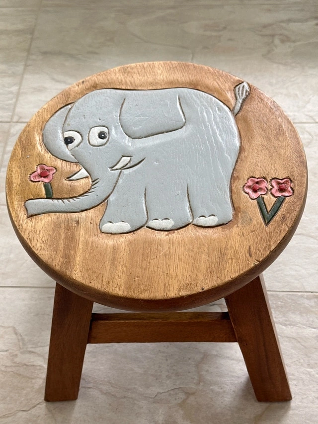 This is a whimsical and sturdy wooden stool featuring an adorable elephant design, perfect for a child's room. This stool has a unique hand-painted elephant and flower design, adding a touch of charm to any space. The stool is brand new and ready for use. It’s a delightful piece that combines practicality with playful artistry. I found similar stools on Kijiji selling for around $20-$40. I'm pricing this in the middle, hoping for a quick sale. * Solid wood construction * Hand-painted design * Perfect for kids If the ad's up, it's still available!