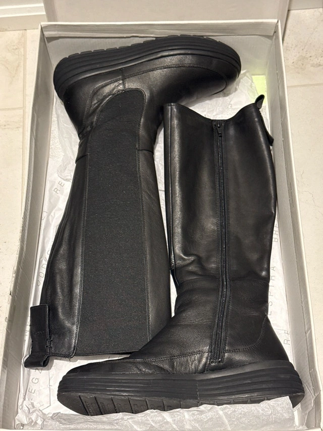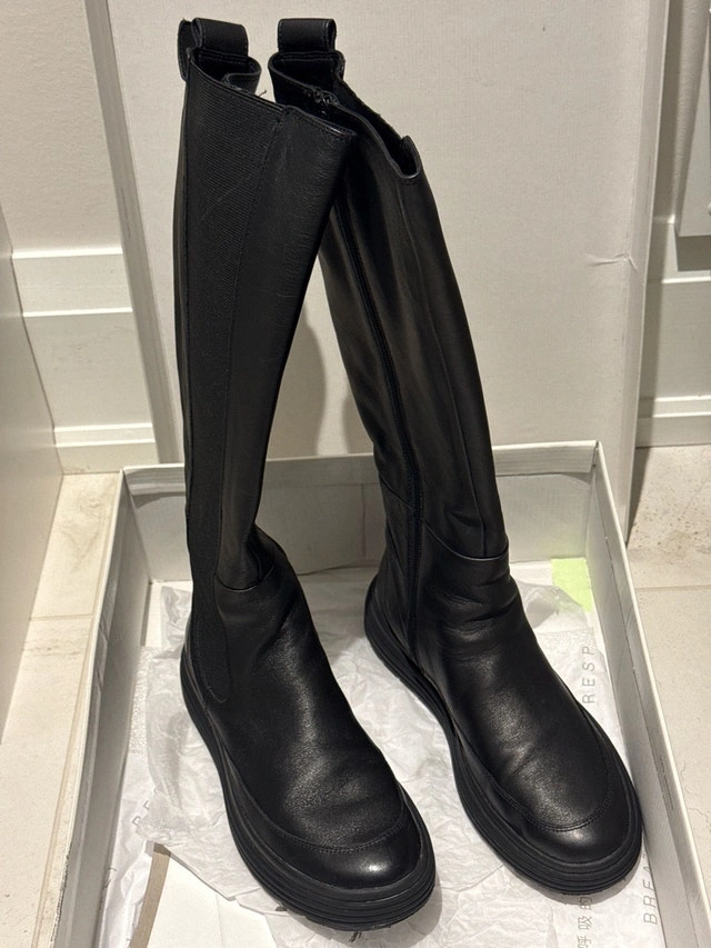 Step out in style with these nearly new Bregasta black leather knee-high boots, size 8! These boots feature a sleek design with a comfortable fit, perfect for any occasion. They show minimal signs of wear, as you can see in the photos. A stylish addition to any wardrobe.