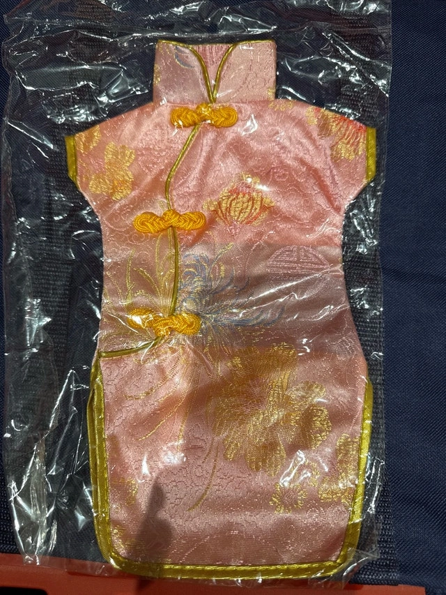 This is a brand new, pink, traditional Chinese dress for a doll, still in its original packaging. It's a beautiful little outfit to add to any doll's wardrobe!