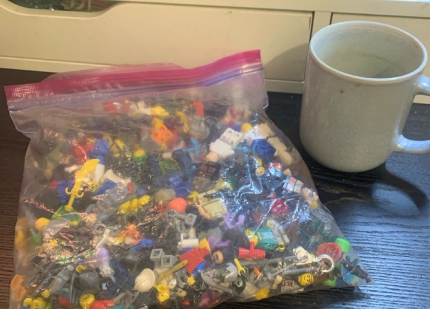 Bag of LEGO Mini figures and Parts
