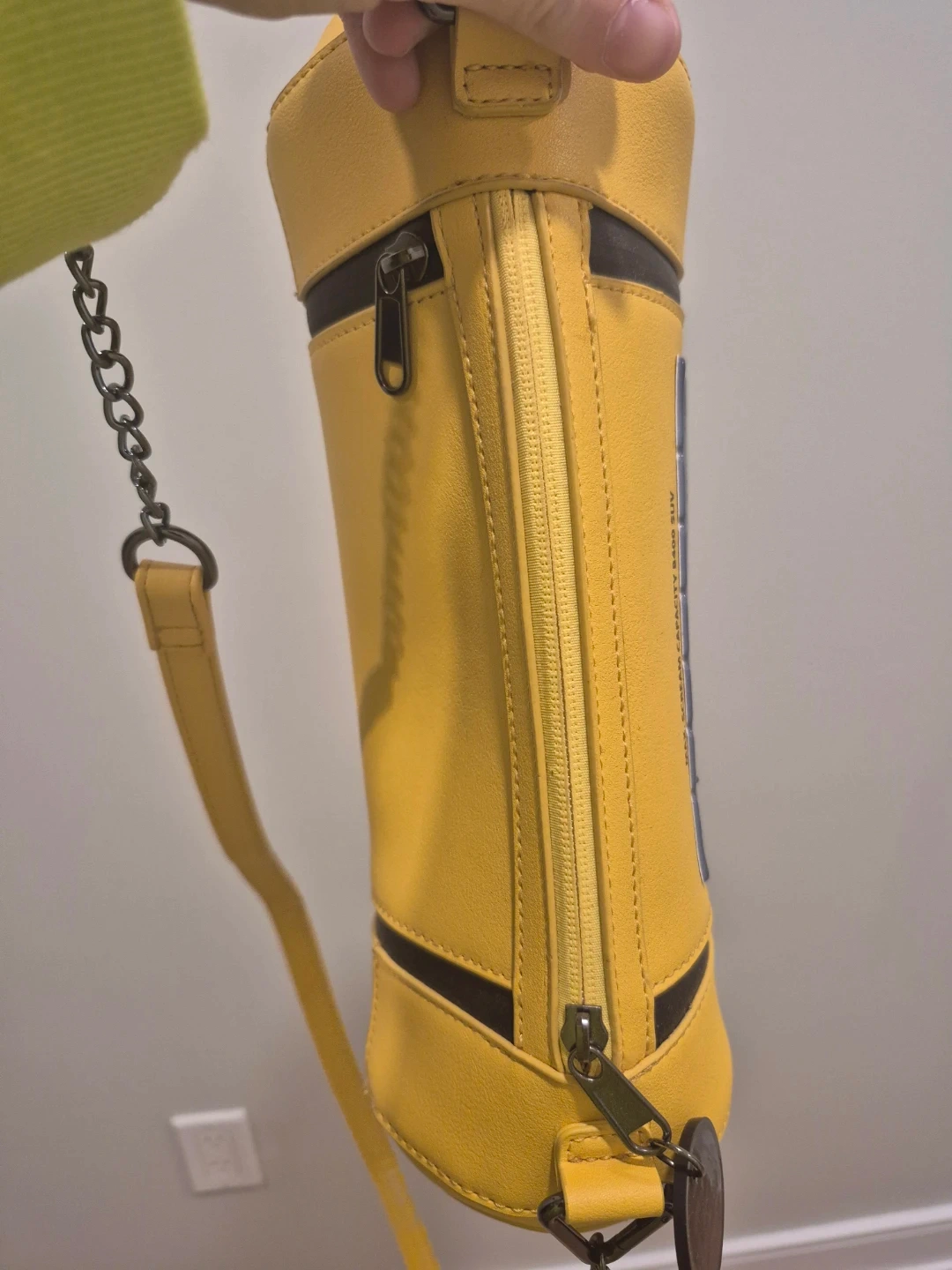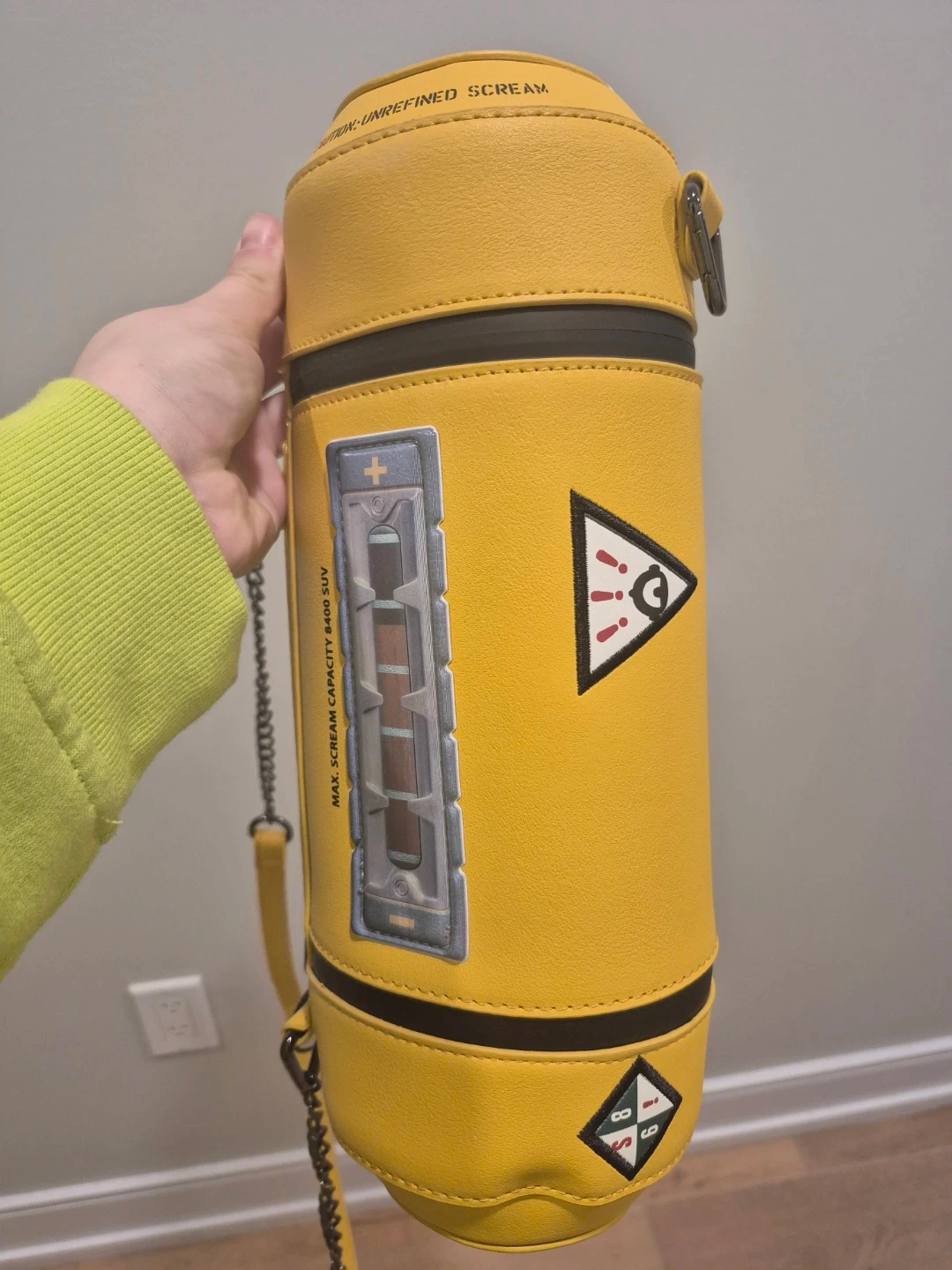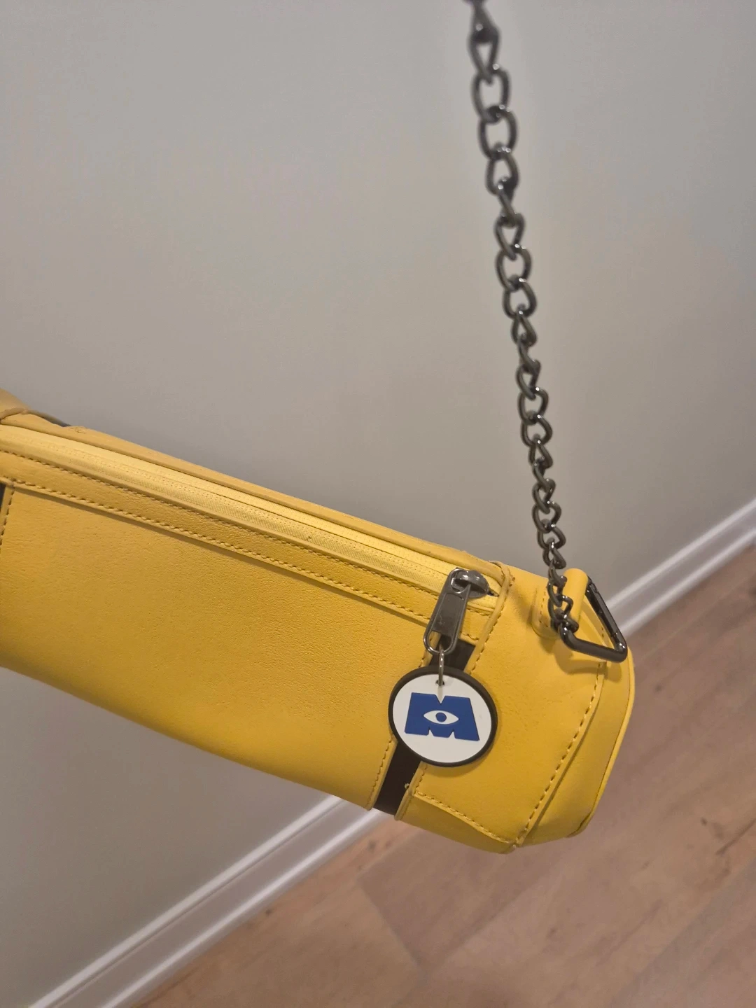Selling a cute Scream Canister handbag. It's a bright yellow colour with a chain strap. The side of the bag says, 'MAX. SCREAM CAPACITY 8400 SUV' and 'CAUTION: UNREFINED SCREAM'. It also has the Monsters, Inc logo on the side. Selling due to being too small to fit my phone 🥲