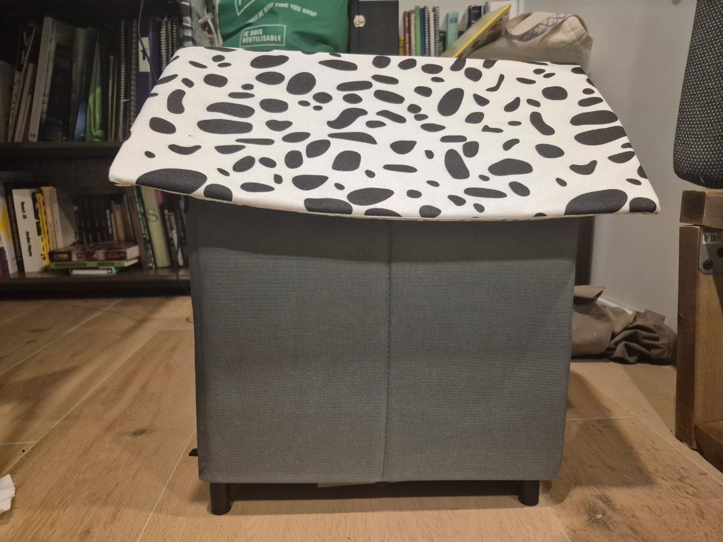 Here's a cozy dog house! It's grey with a cute Dalmatian print roof. The roof has a zipper, so you can easily remove it if you want to. It unfortunately never had a resident, so it is scent and fur free.