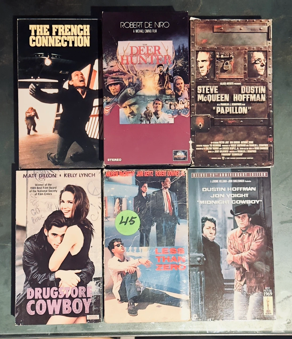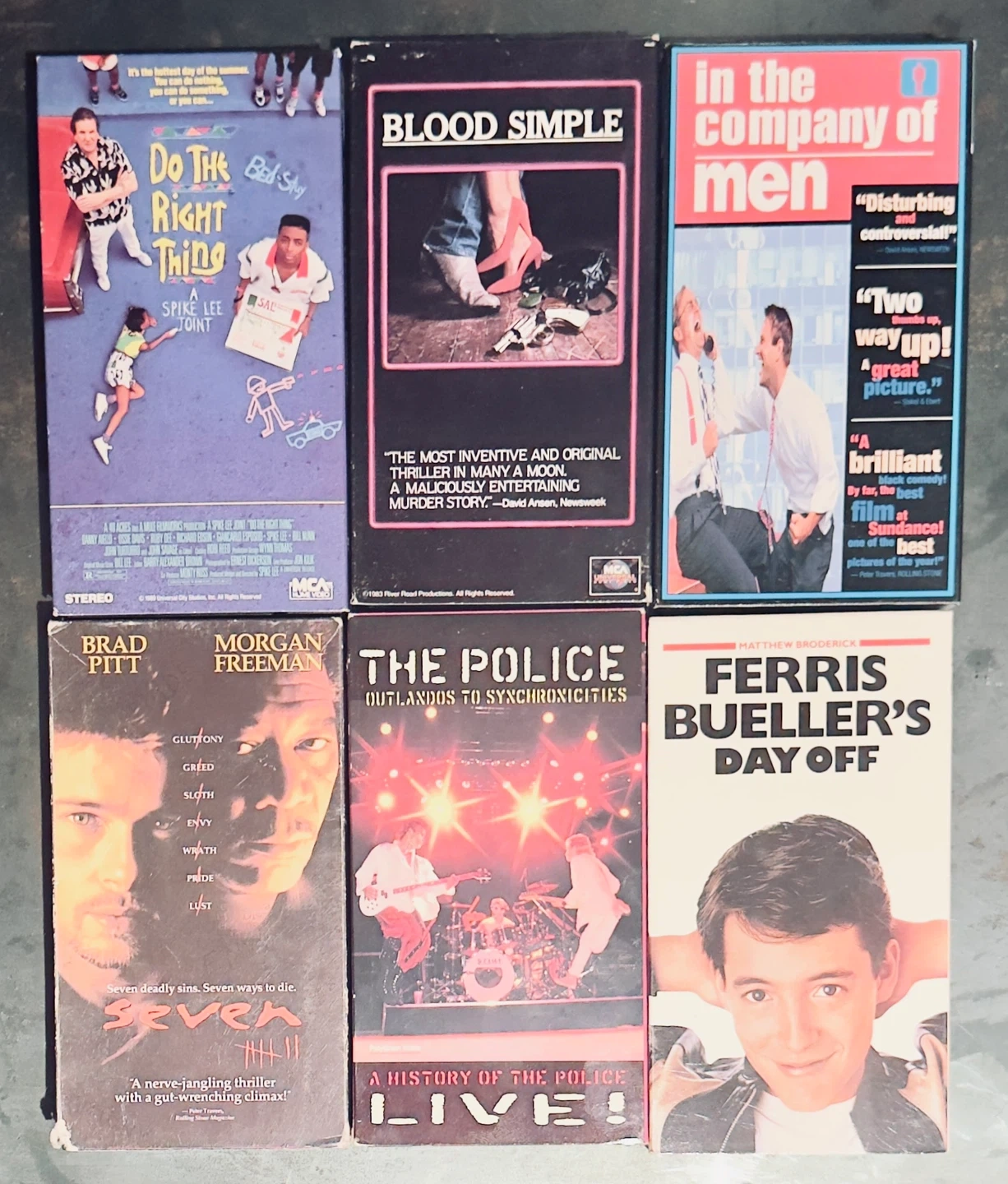 Selling a collection of VHS tapes with classic movies like The Godfather trilogy, Chinatown, One Flew Over the Cuckoo's Nest, and more! Titles include The Blues Brothers, Ferris Bueller's Day Off, and Monty Python's Life of Brian. A great way to relive some cinematic history!