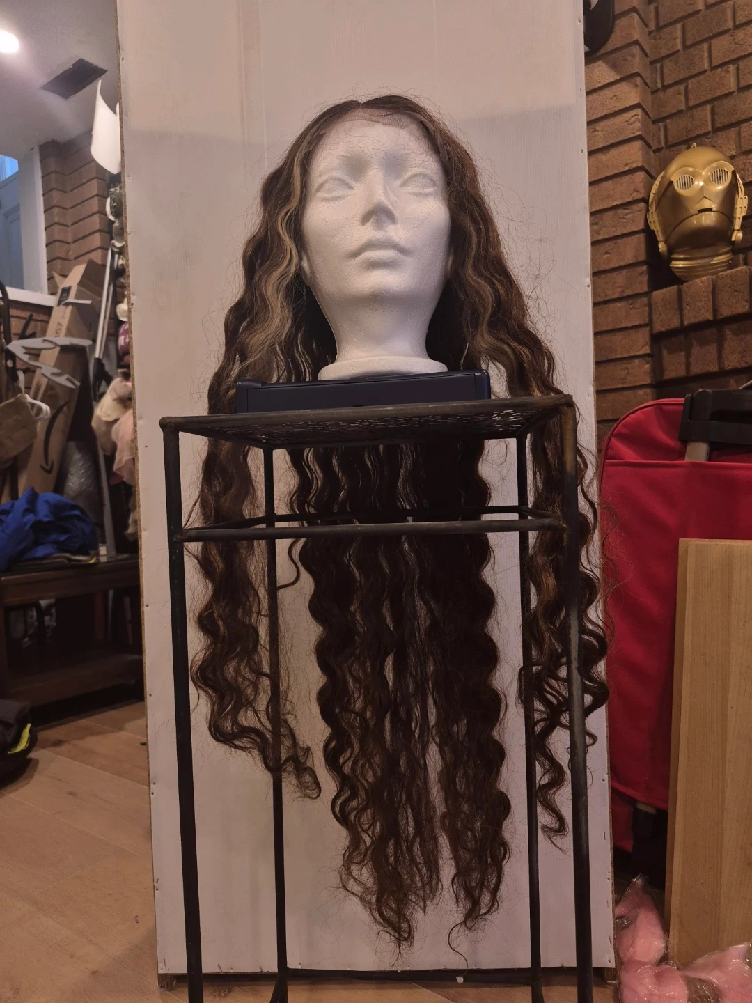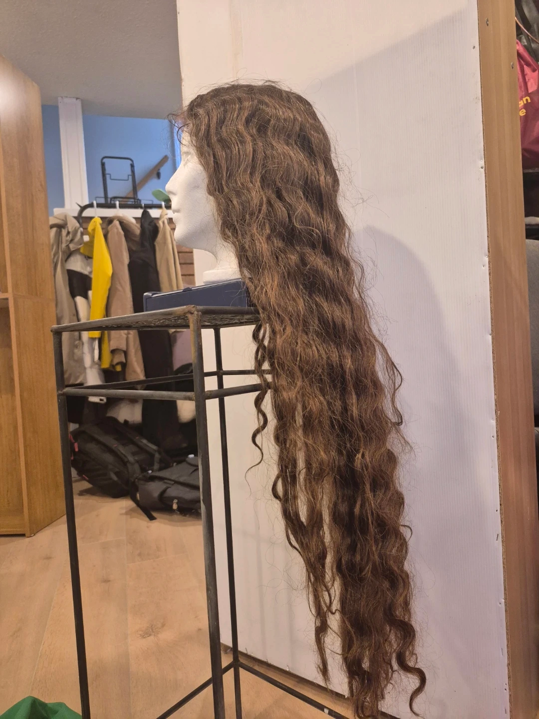 Selling a long, brown, curly wig. It appears to be in good condition and has a natural-looking curl pattern. Perfect for changing up your look or for costume use!