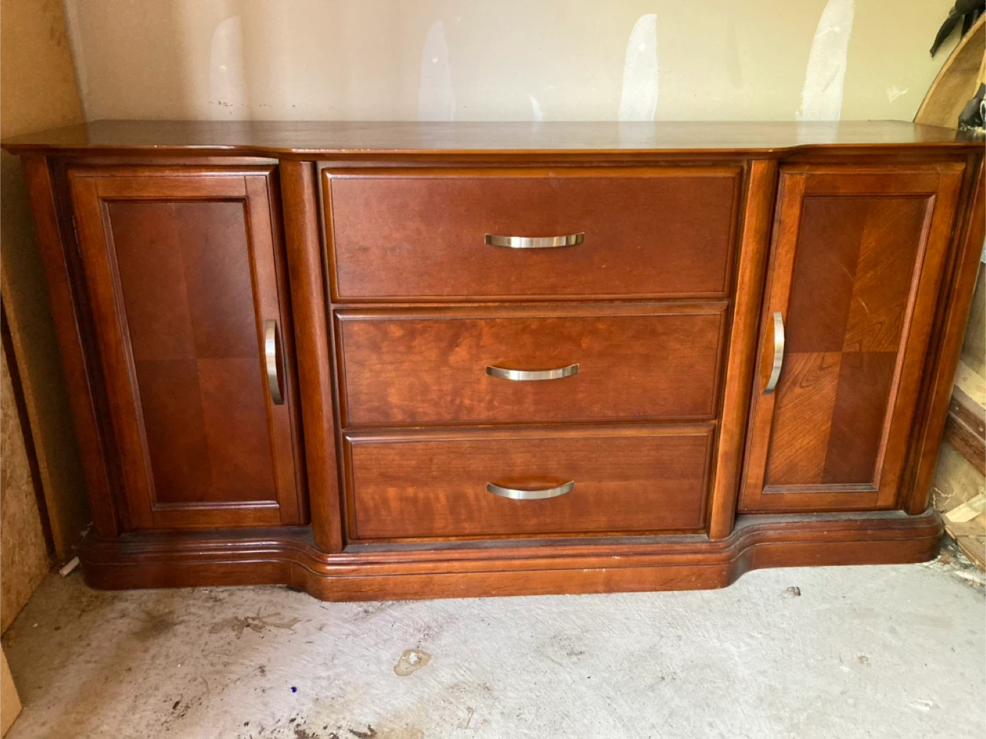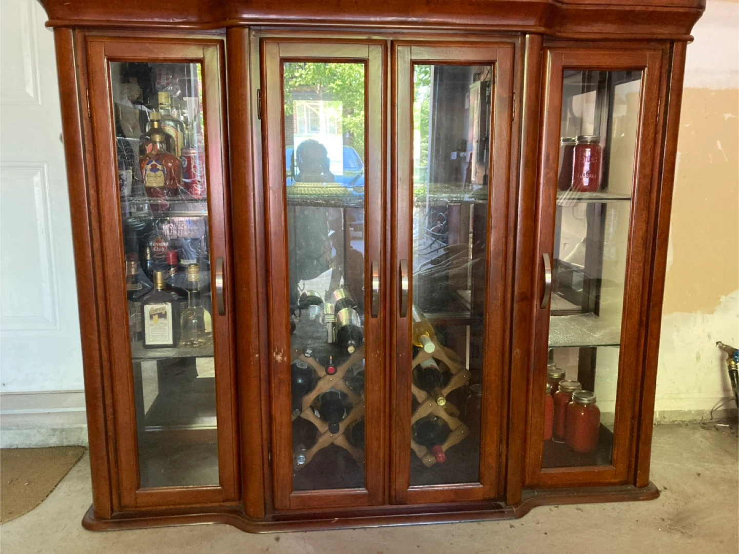 Selling a wooden buffet with a hutch. It features a warm, brown finish. The buffet has drawers and cabinets for storage, while the hutch has glass doors, perfect for displaying items. It's a great piece to add to your dining or living area!