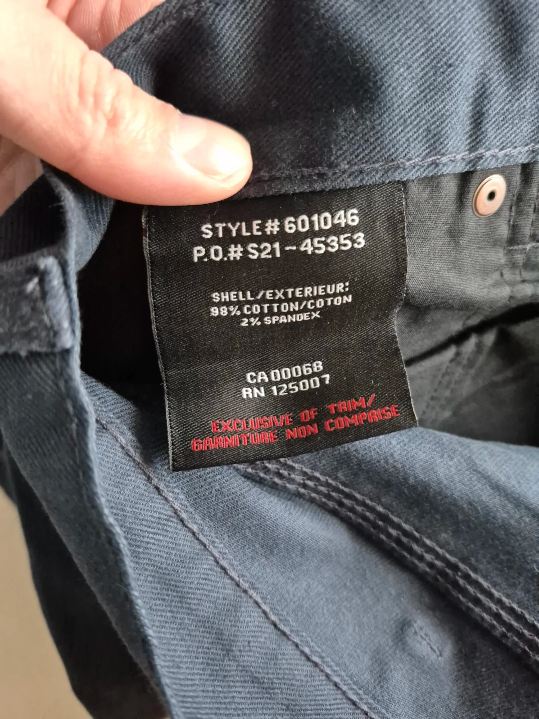 Zipper fly, rivets at stress points, and a stain‑repellent finish.