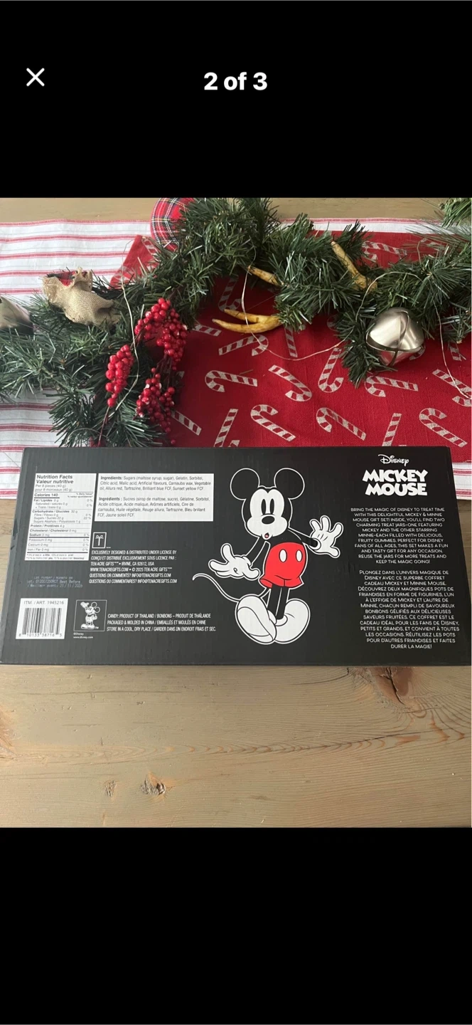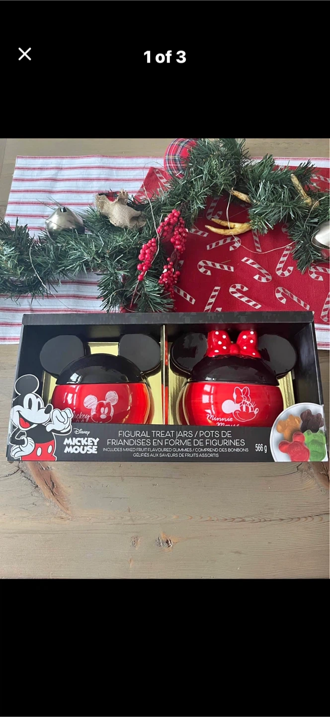 Selling a set of Disney Mickey Mouse figural treat jars! These adorable jars are perfect for storing candies or small treats. The box includes both Mickey and Minnie Mouse jars, each with a capacity of 566g. They are in great condition and come in the original box!
