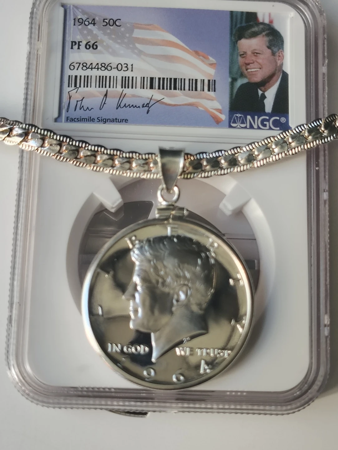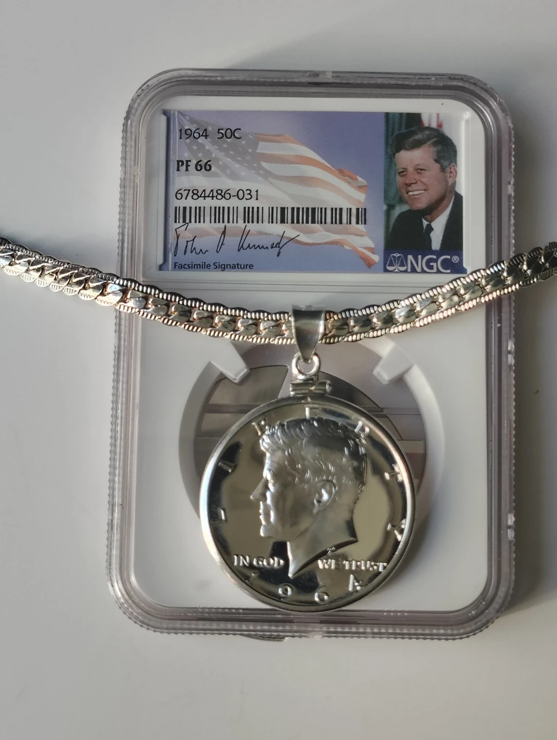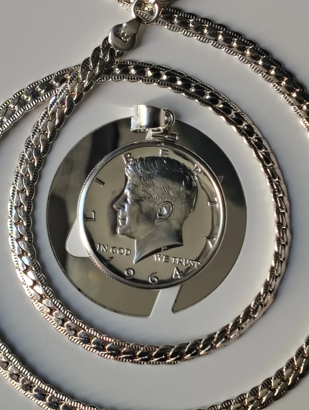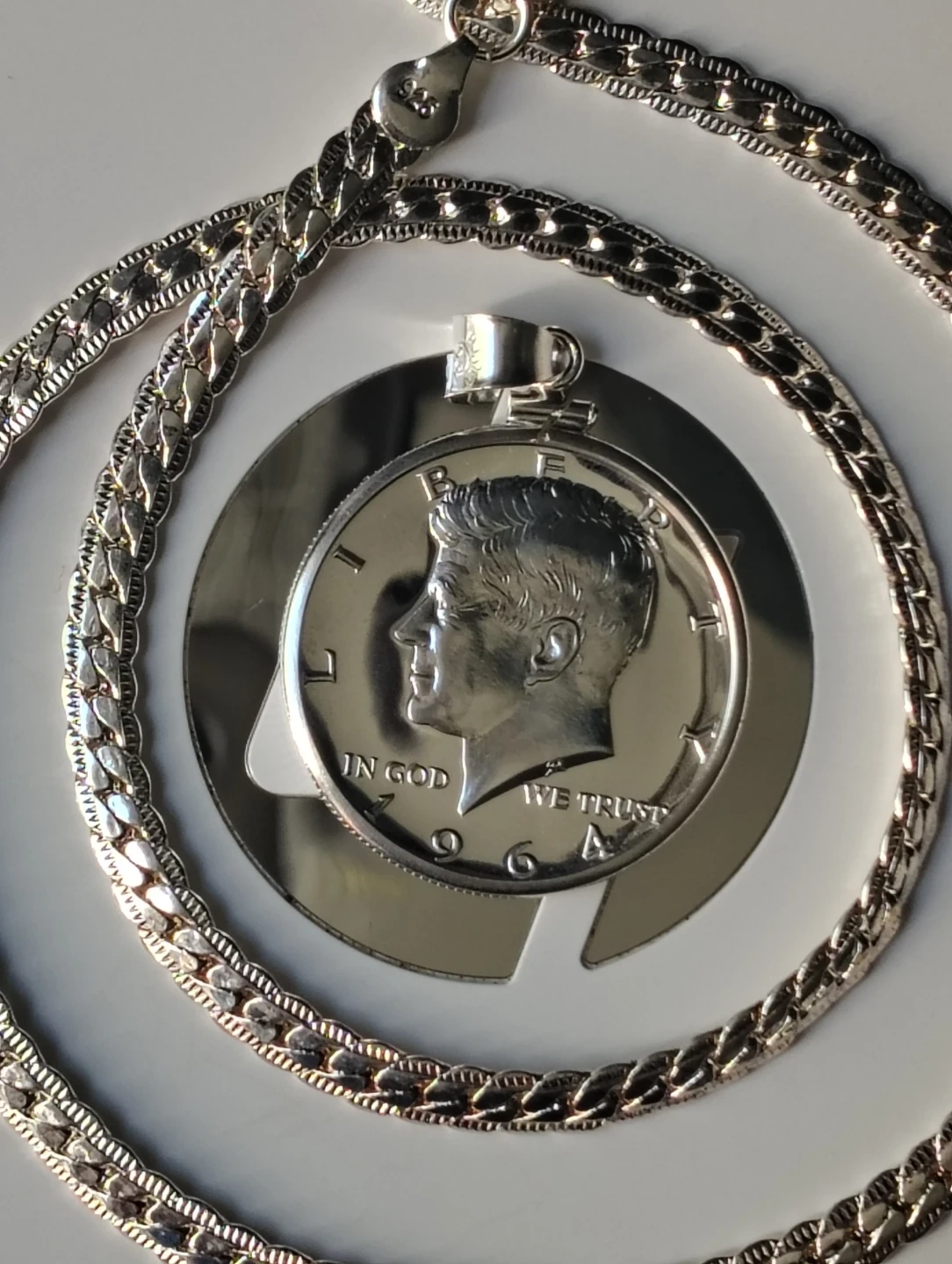 Here's a unique pendant necklace featuring a genuine Kennedy Half Dollar from 1964. The coin is set in a silver-tone pendant with a matching chain. A cool piece for coin collectors or anyone who appreciates vintage jewelry!