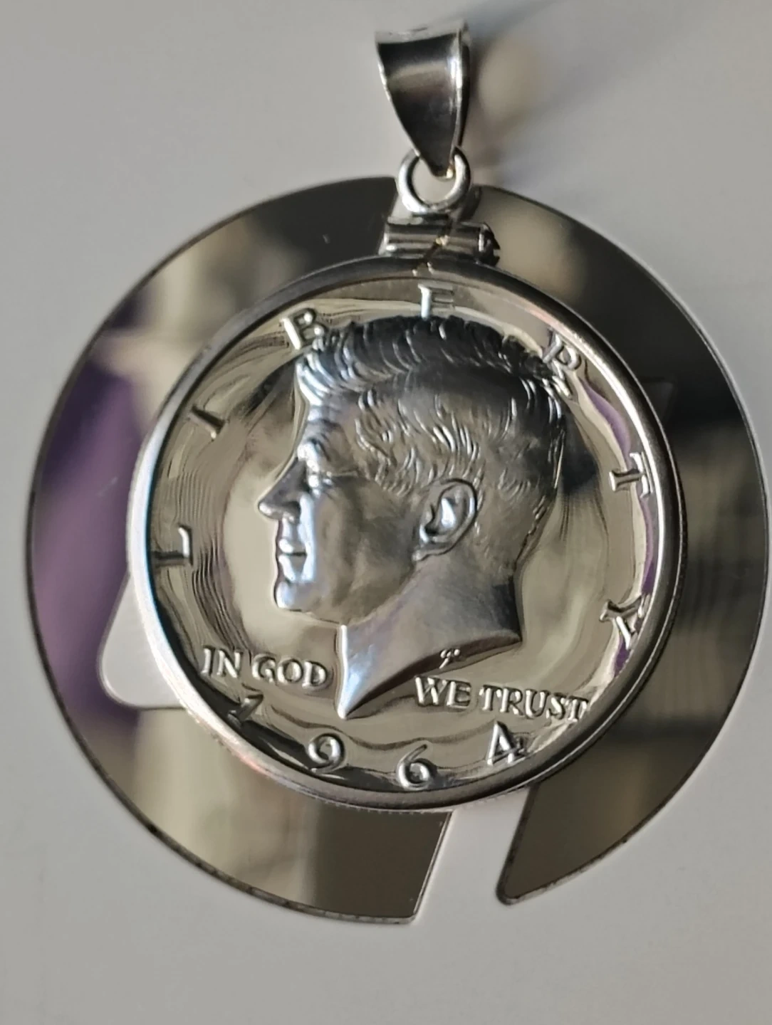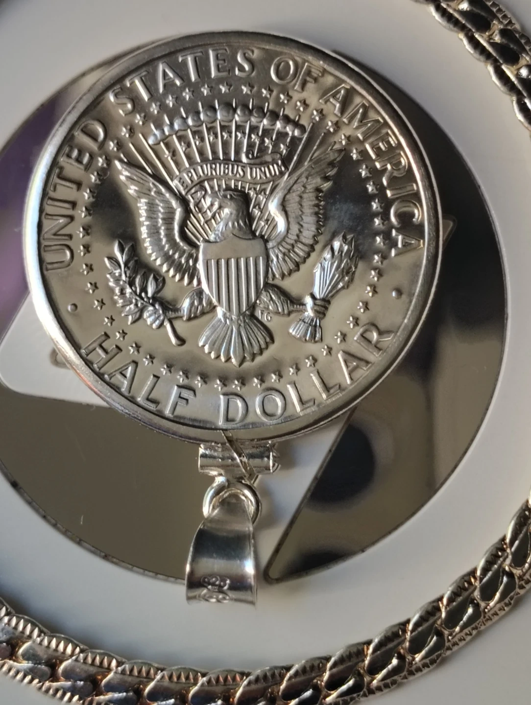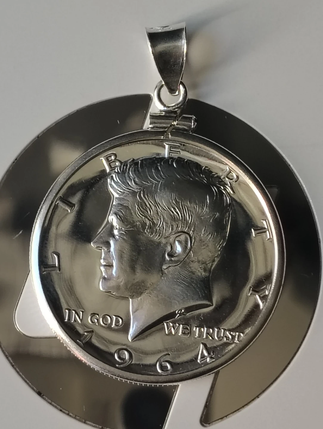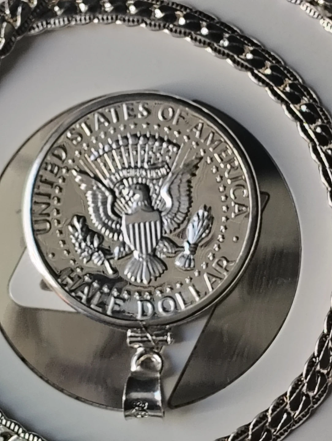 Here's a unique pendant necklace featuring a genuine Kennedy Half Dollar from 1964. The coin is set in a silver-tone pendant with a matching chain. A cool piece for coin collectors or anyone who appreciates vintage jewelry!