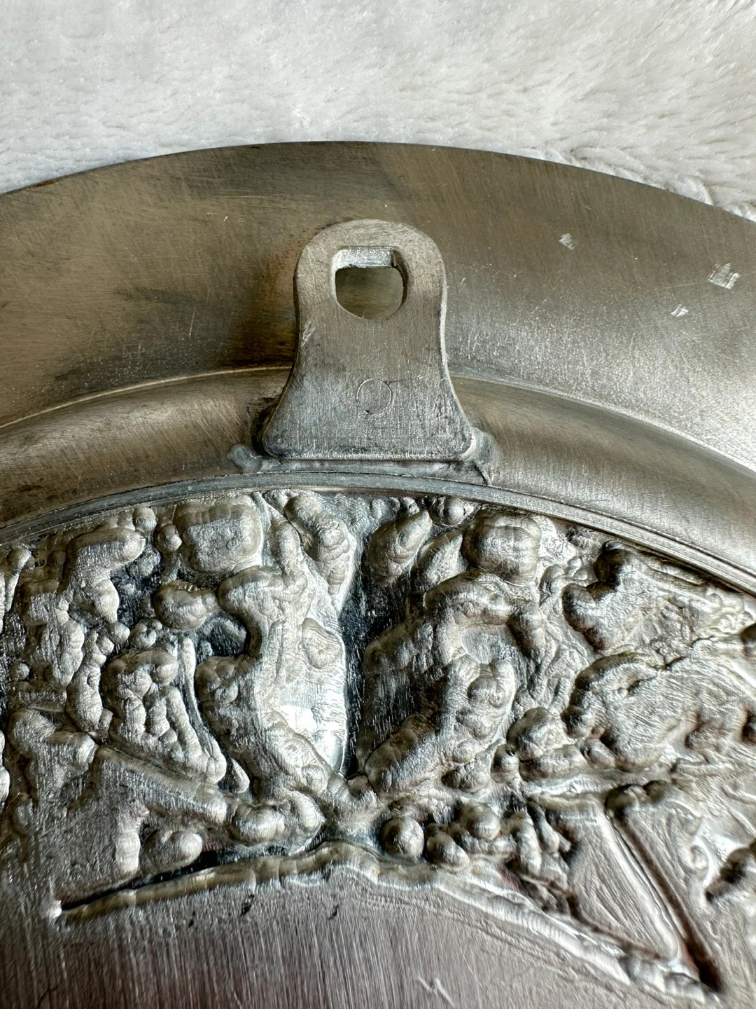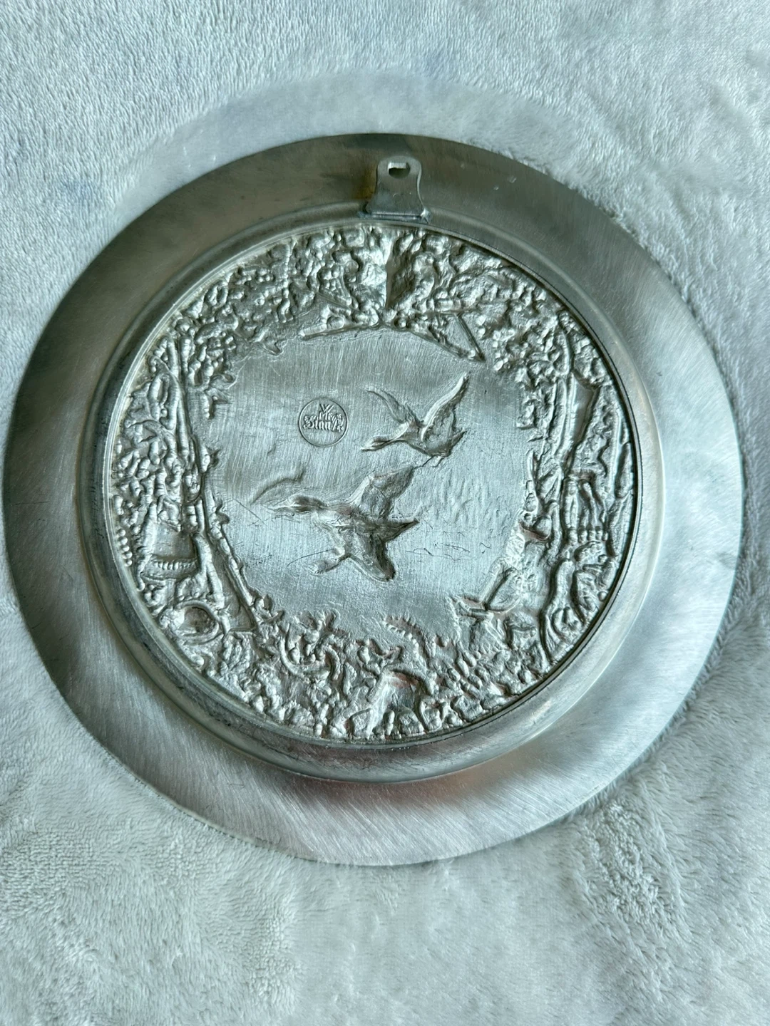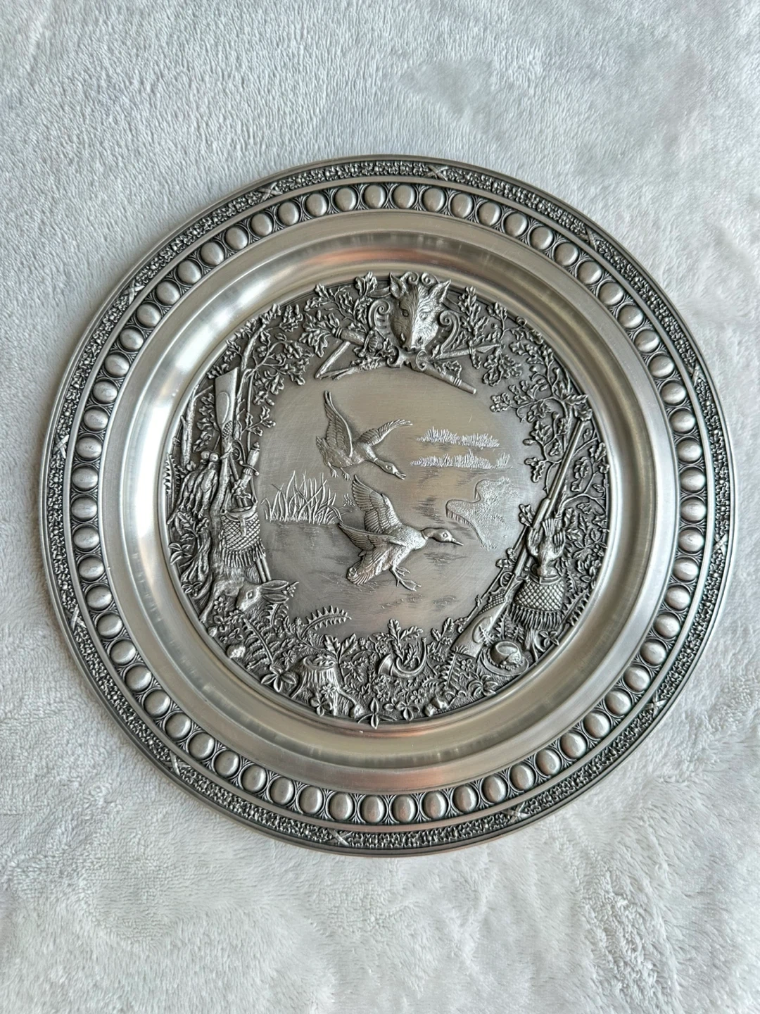 Selling a vintage WMF Zinn pewter plate. It features a detailed hunting scene with ducks and rifles. The plate has a classic design and would make a nice decorative item!