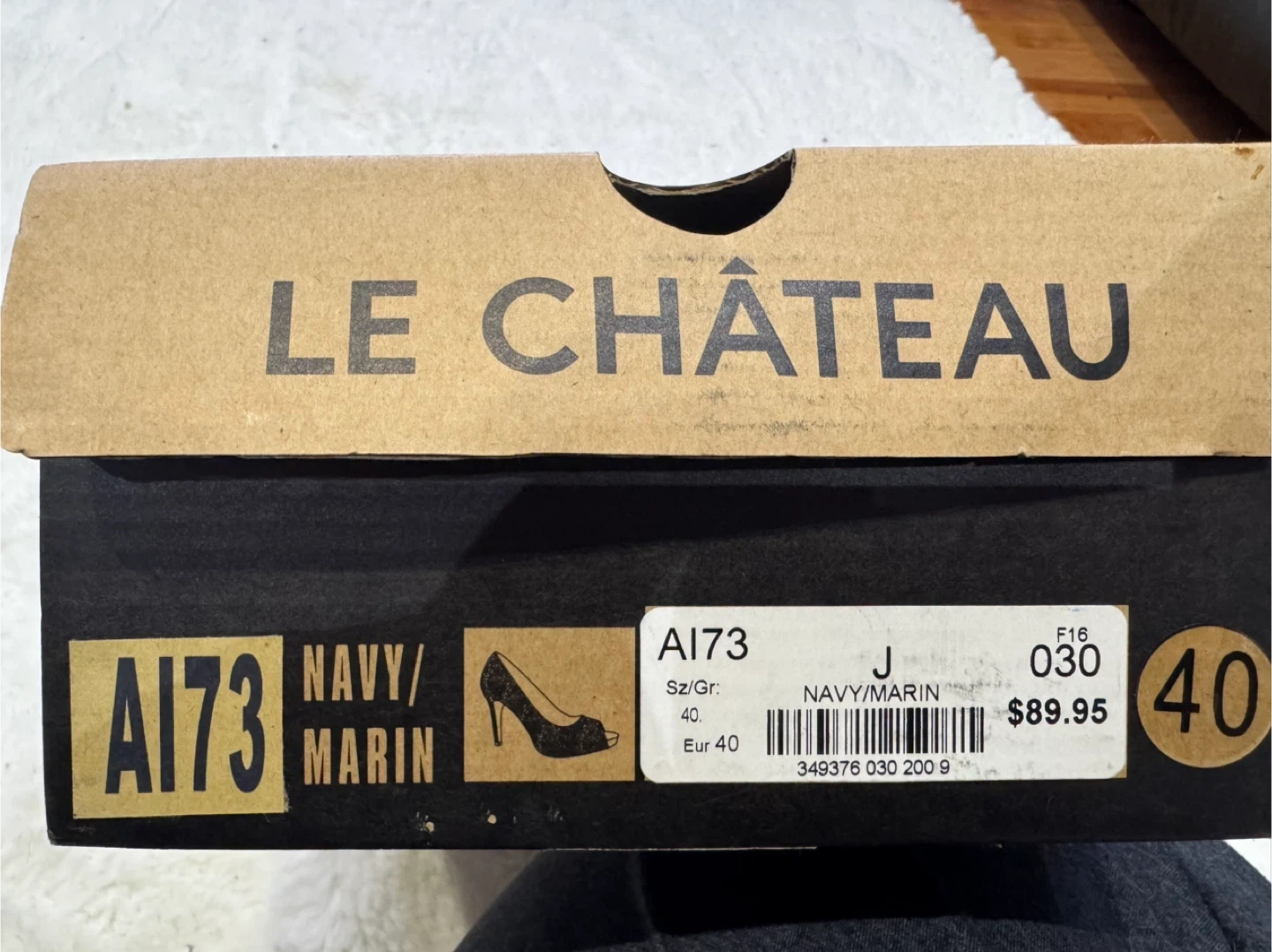 Le Chateau navy heels in excellent condition! These are a size 40, which is a size 10 in Canadian sizing. They feature a peep toe and a stiletto heel. Originally bought for $89.95 and come with the box
