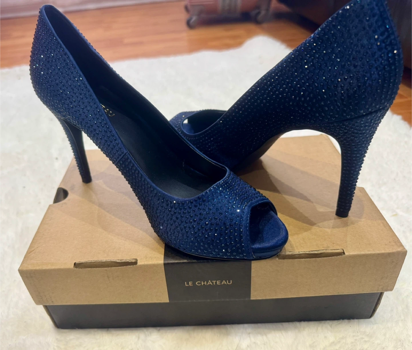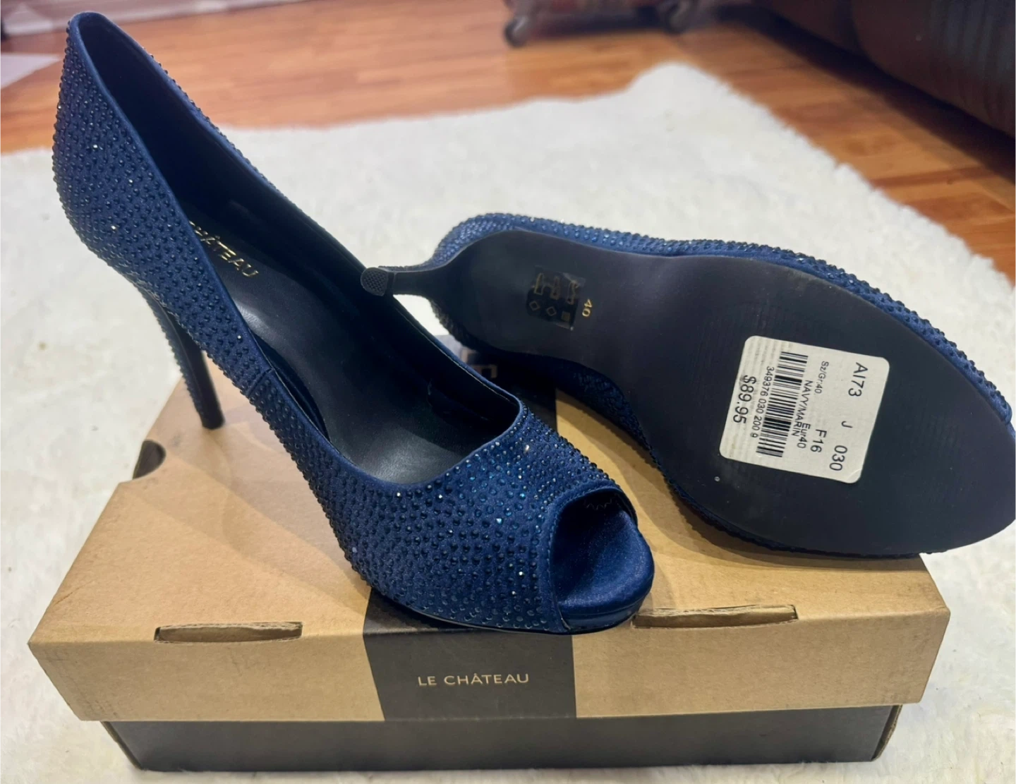Le Chateau navy heels in excellent condition! These are a size 40, which is a size 10 in Canadian sizing. They feature a peep toe and a stiletto heel. Originally bought for $89.95 and come with the box
