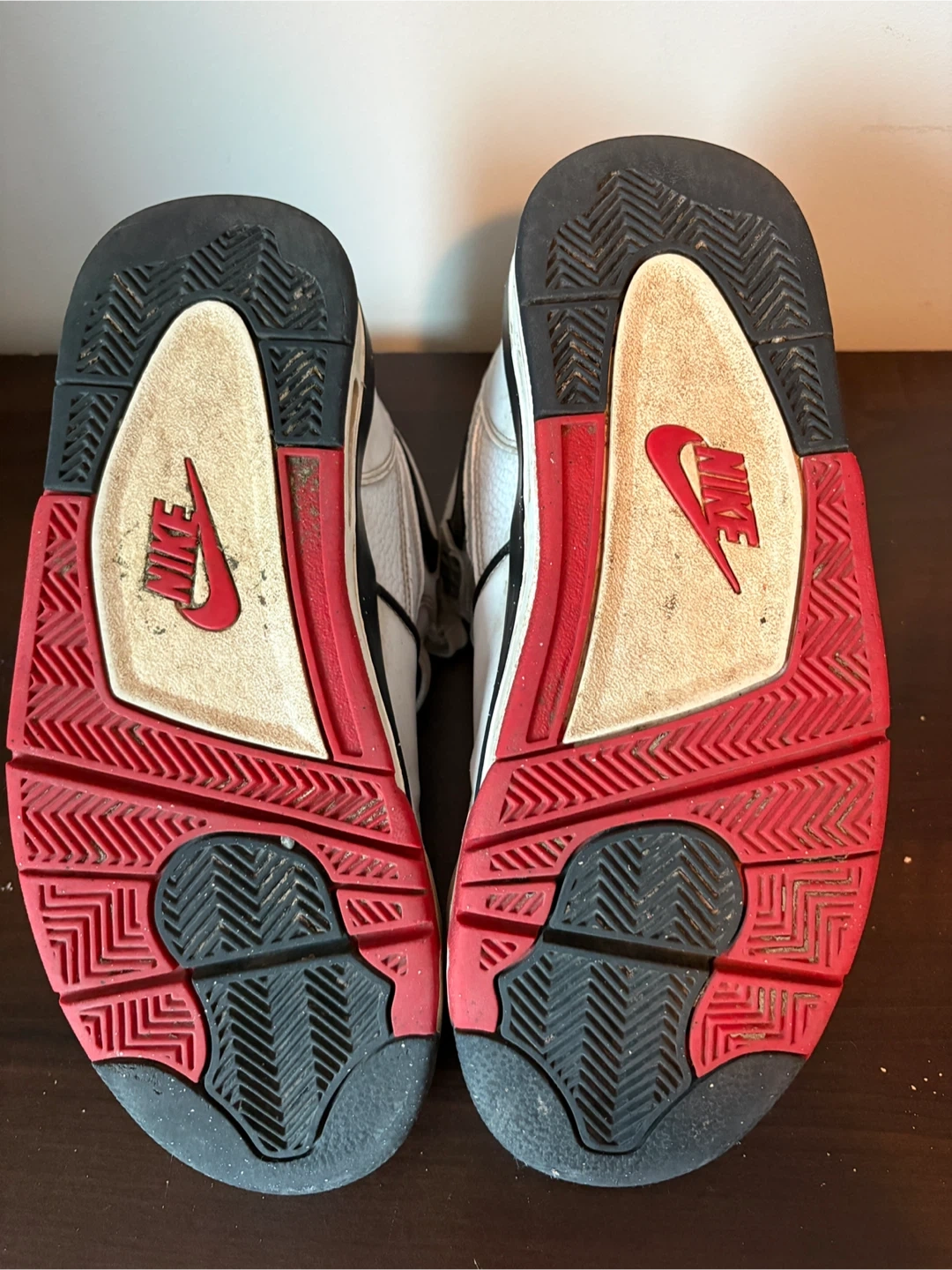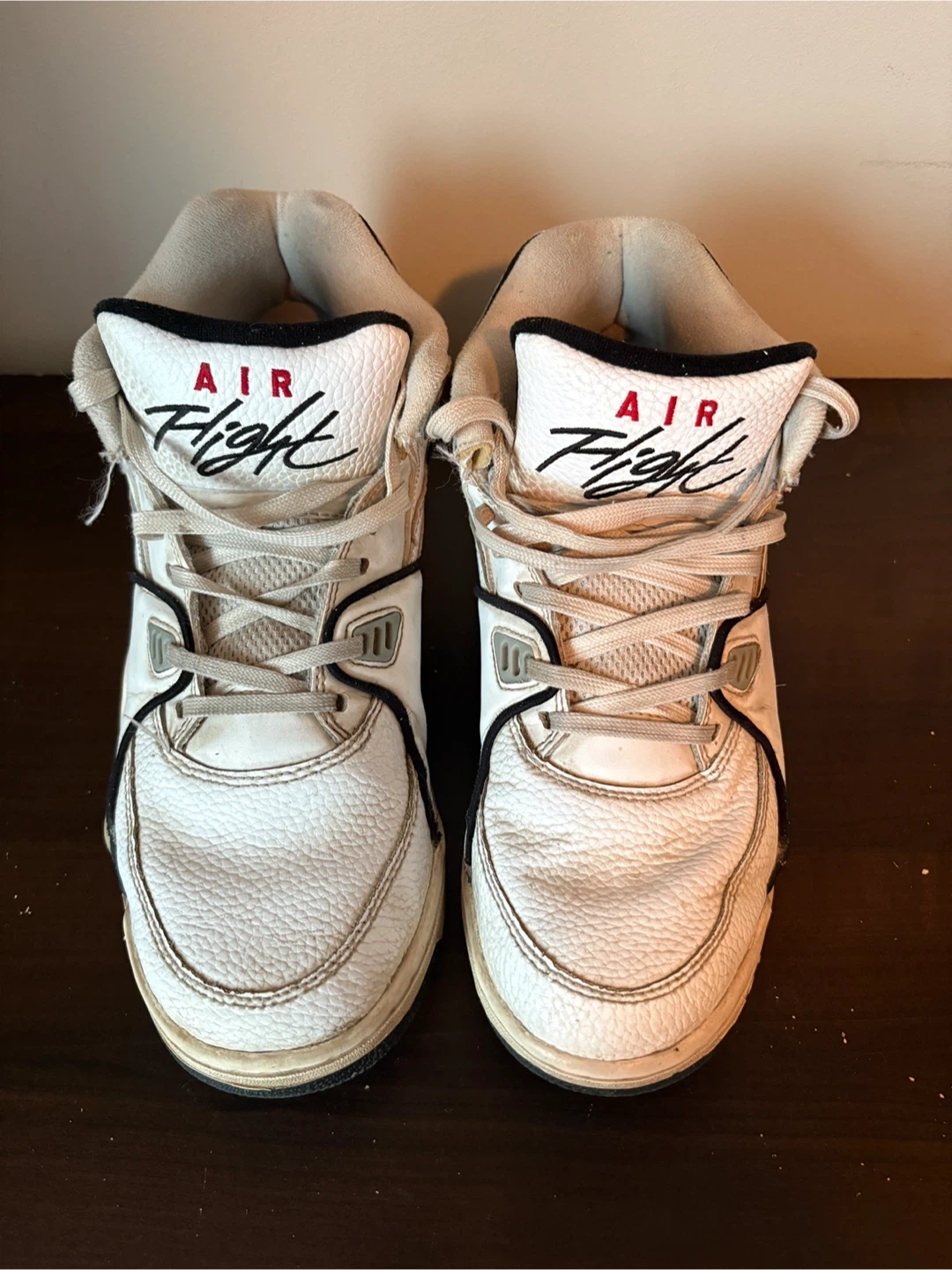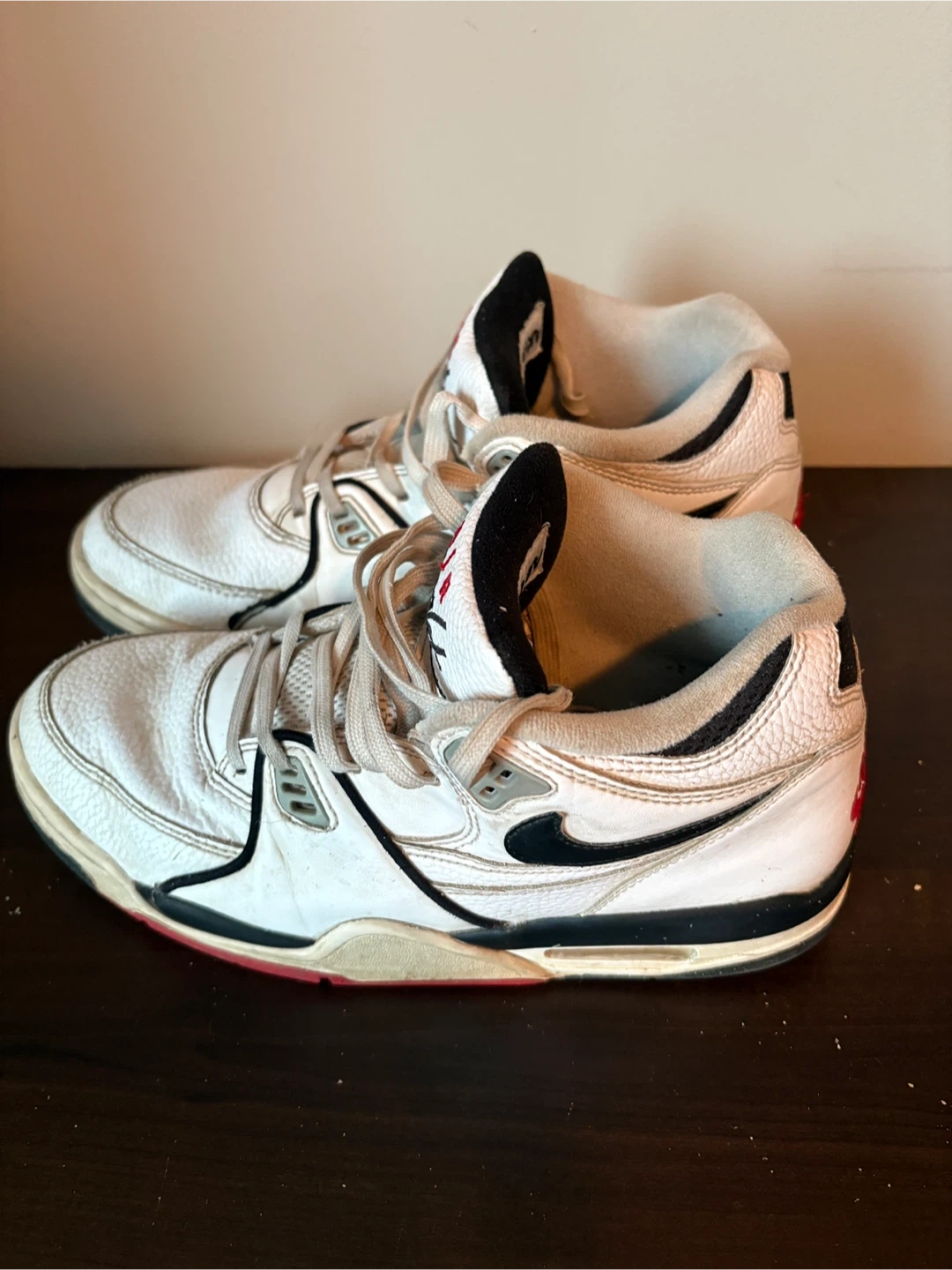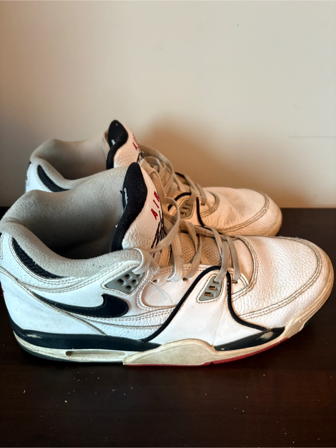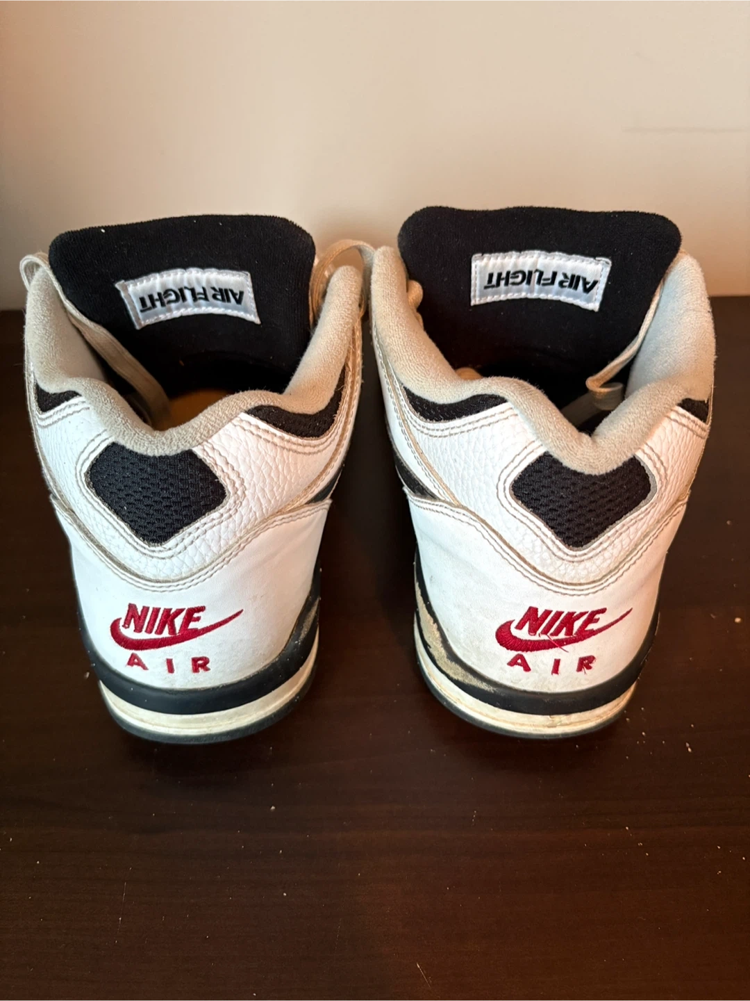 Selling a pair of Nike Air Flight sneakers. They're white with black and red accents. They show some signs of wear, but still have lots of life left!