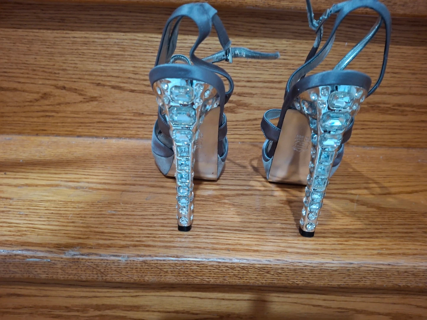 These are a pair of Nina evening heels in a size 8.5. They are a beautiful silver colour and have a rhinestone heel. They are in good condition.