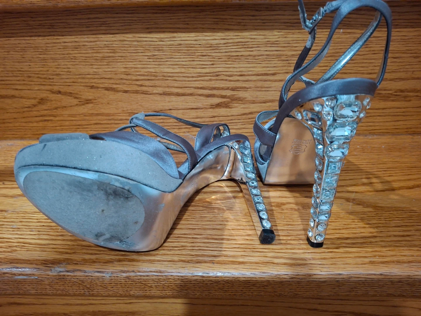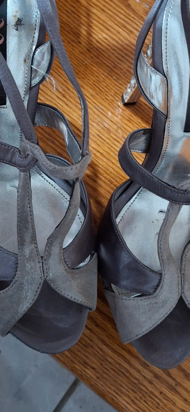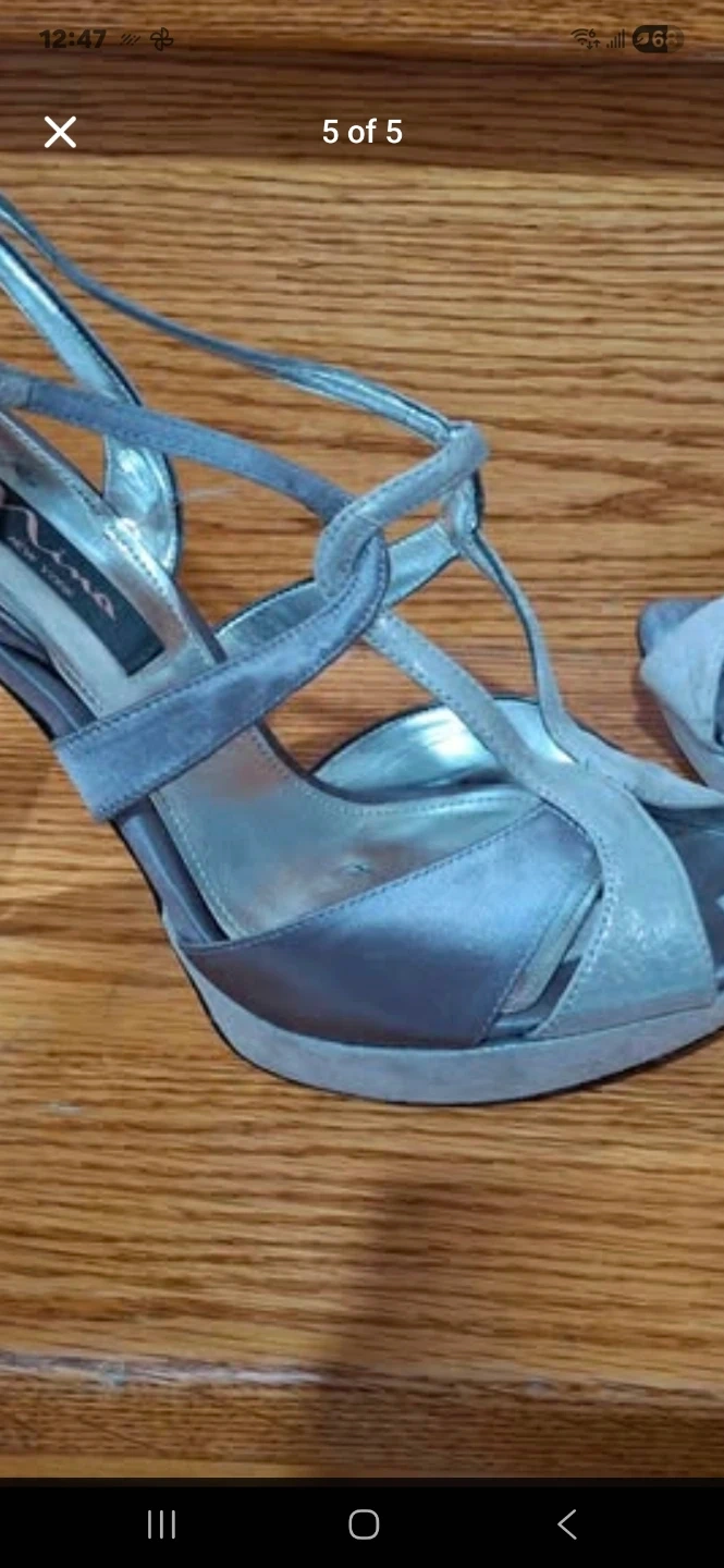These are a pair of Nina evening heels in a size 8.5. They are a beautiful silver colour and have a rhinestone heel. They are in good condition.