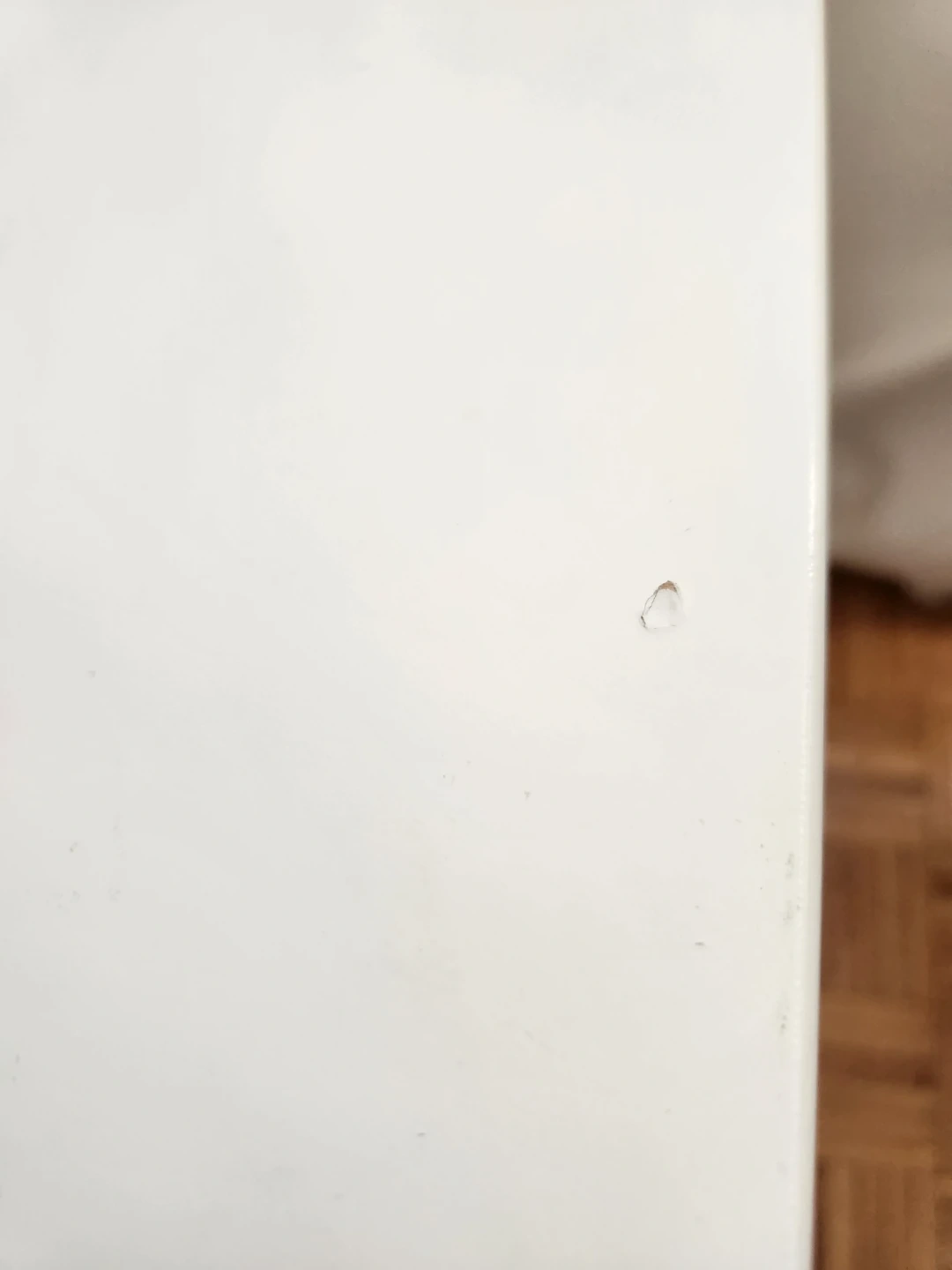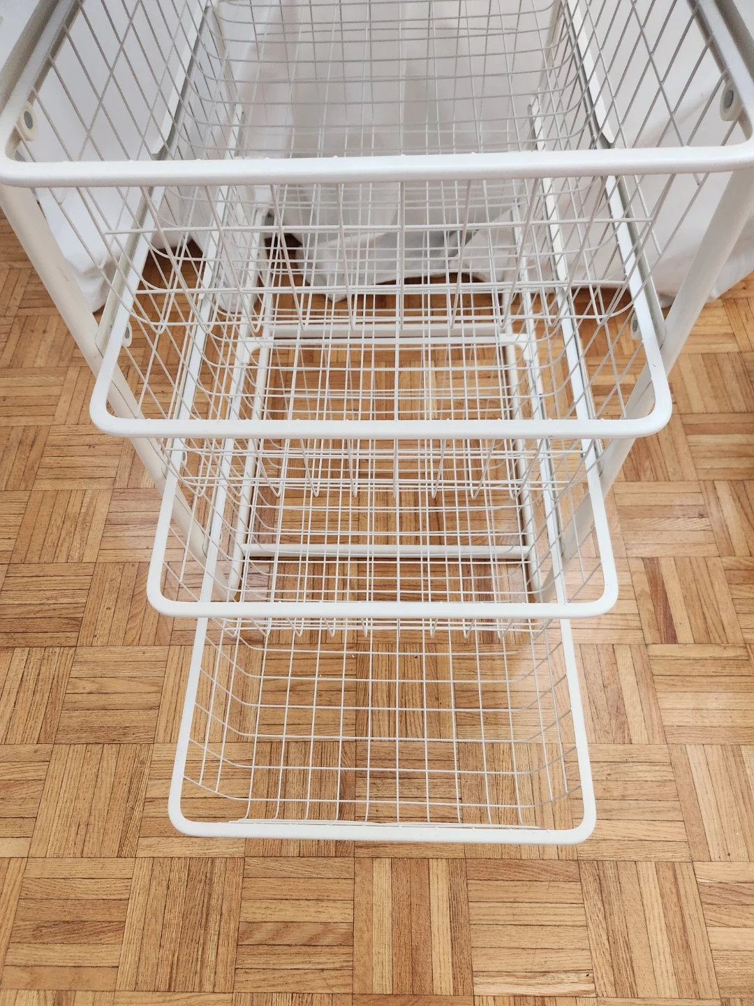Here's a handy white metal storage unit with three drawers! It's perfect for organizing your space. There is a small blemish on the top.