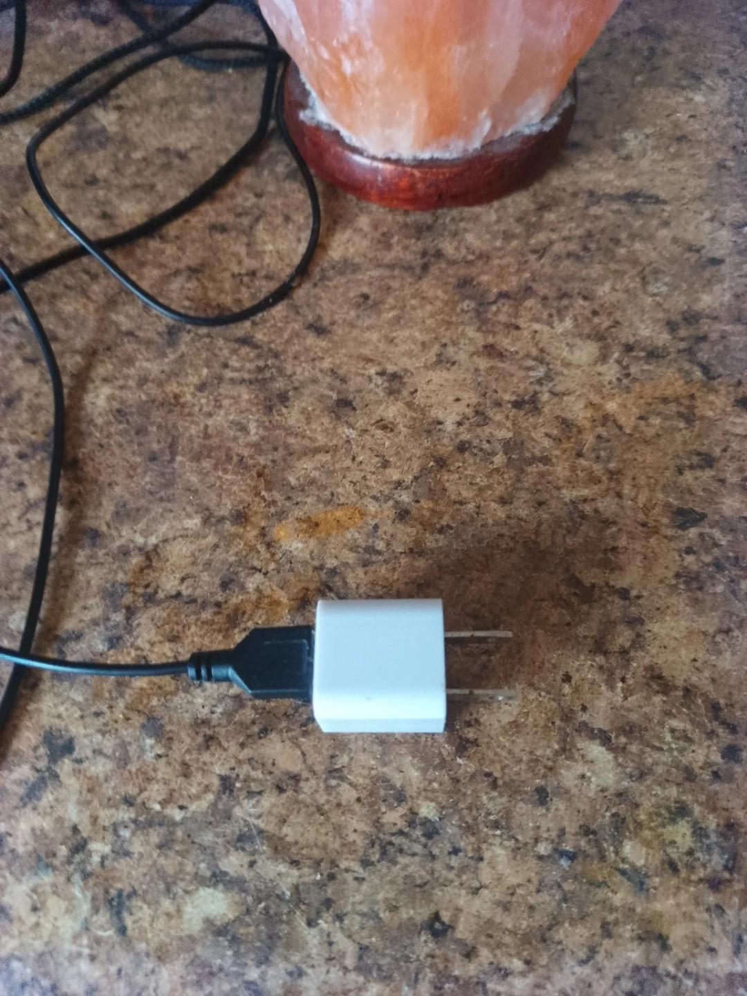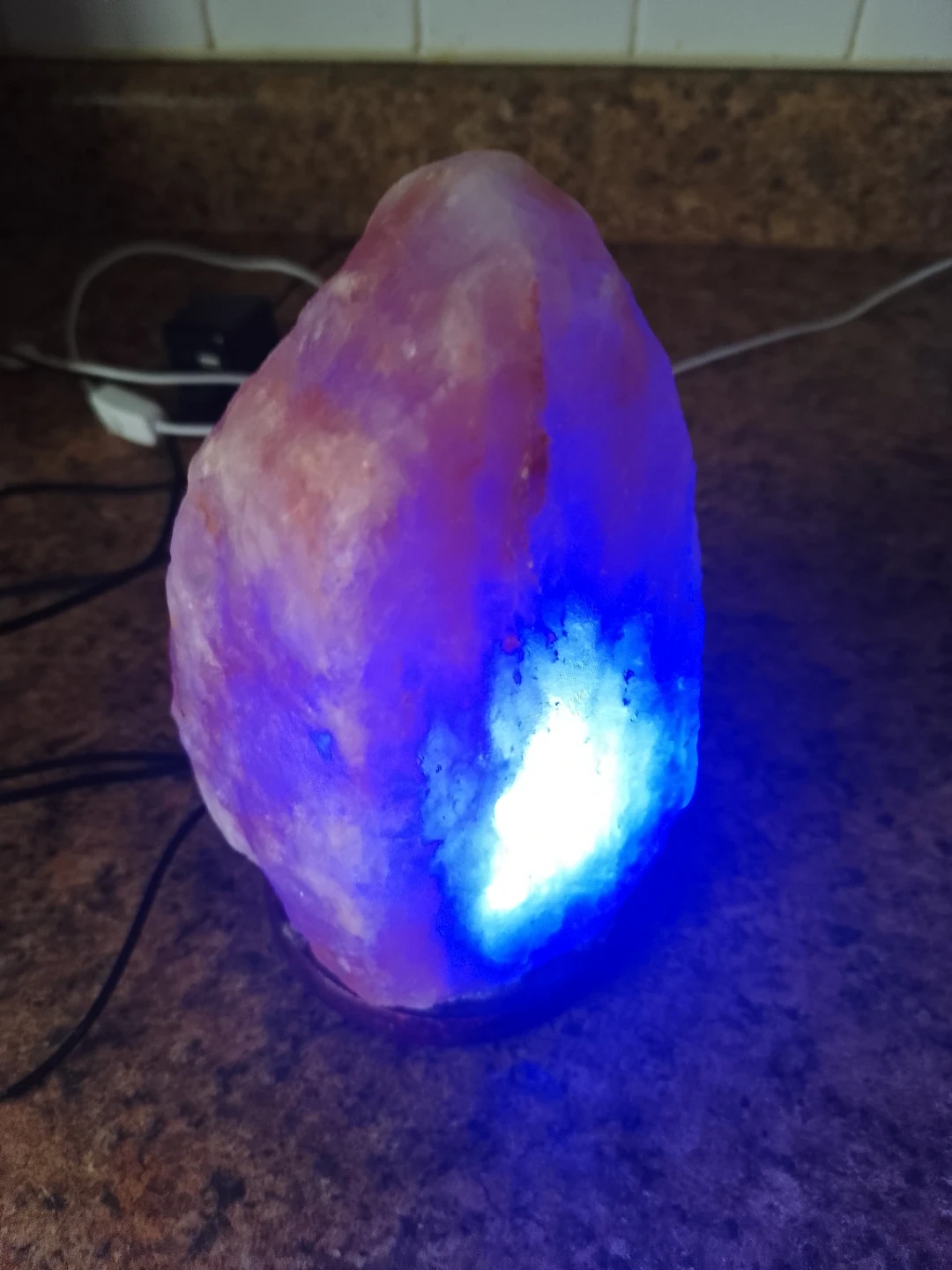 Here's a Himalayan salt lamp that creates a warm and relaxing glow! It comes with its charger so you can easily plug it in and enjoy the soothing light. It's in great condition and ready to brighten up your space