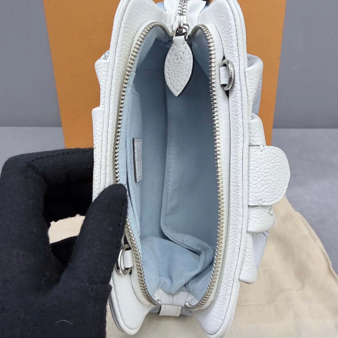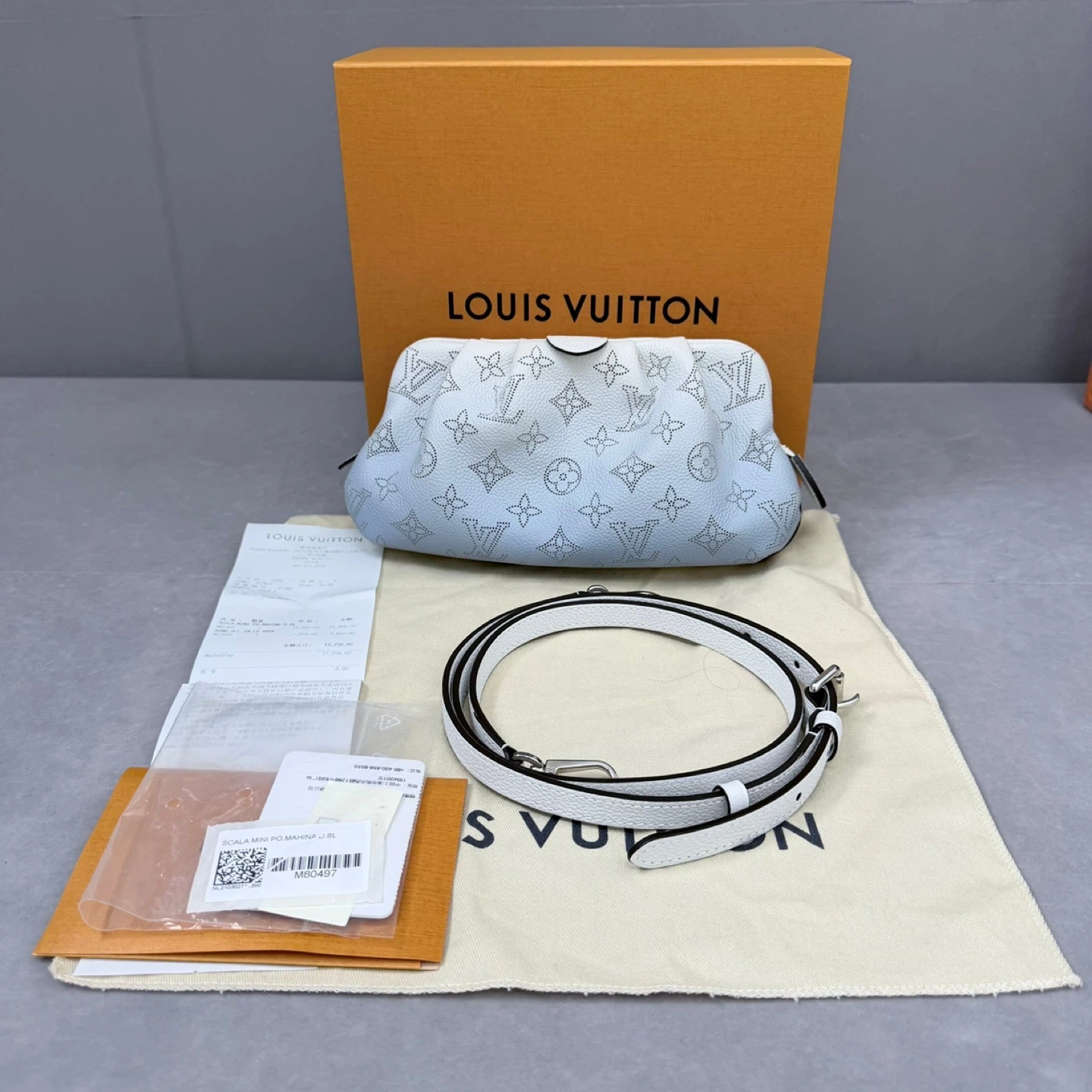This Louis Vuitton Mahina Micro Pochette is in excellent condition and comes with its original box. It's a stylish and compact accessory, perfect for carrying your essentials. The bag features the iconic Louis Vuitton monogram in a perforated design. An additional strap is included.