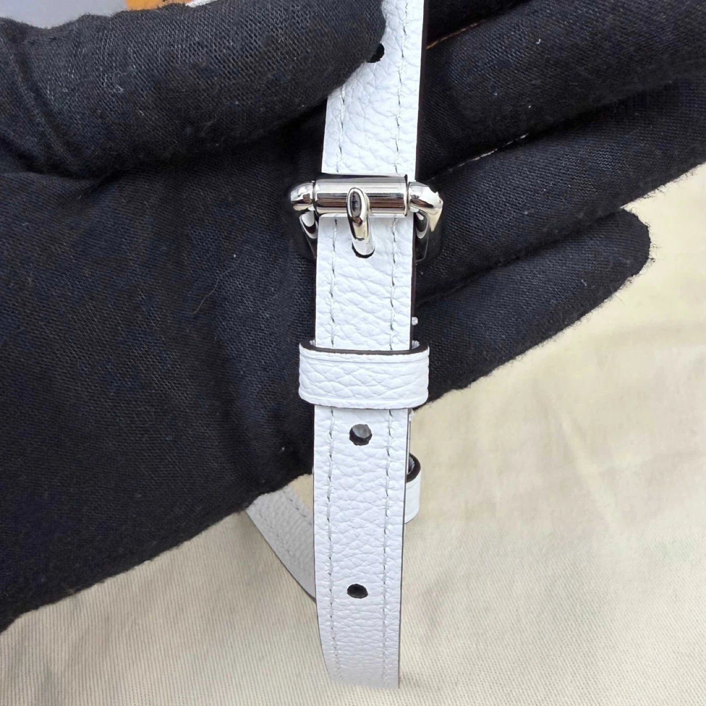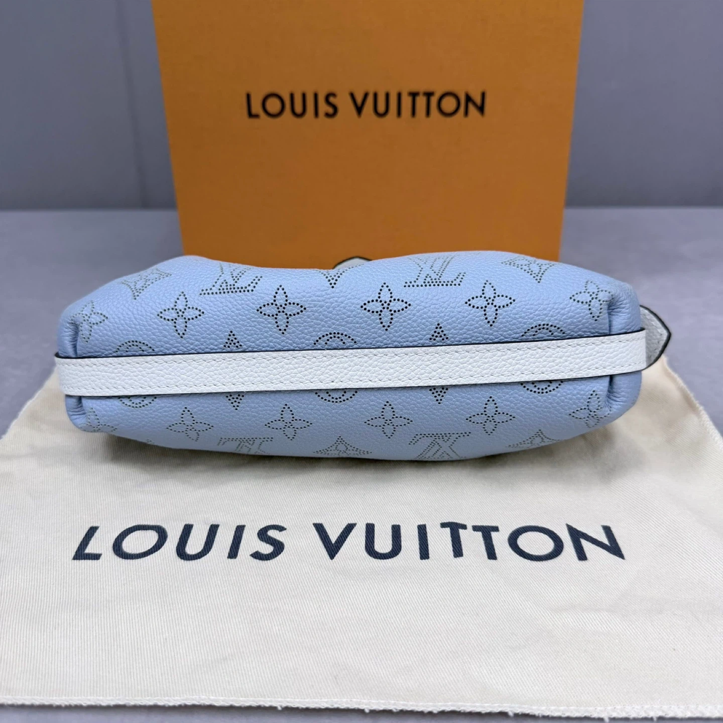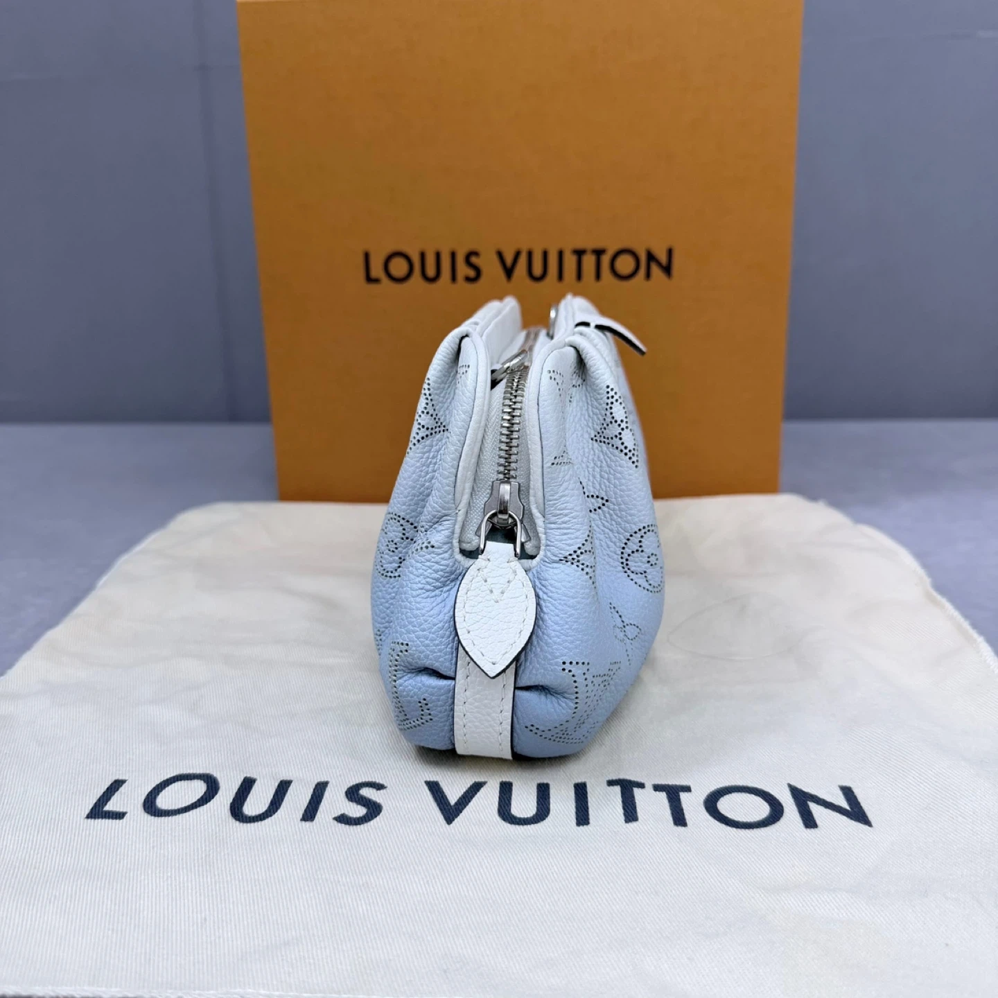 This Louis Vuitton Mahina Micro Pochette is in excellent condition and comes with its original box. It's a stylish and compact accessory, perfect for carrying your essentials. The bag features the iconic Louis Vuitton monogram in a perforated design. An additional strap is included.