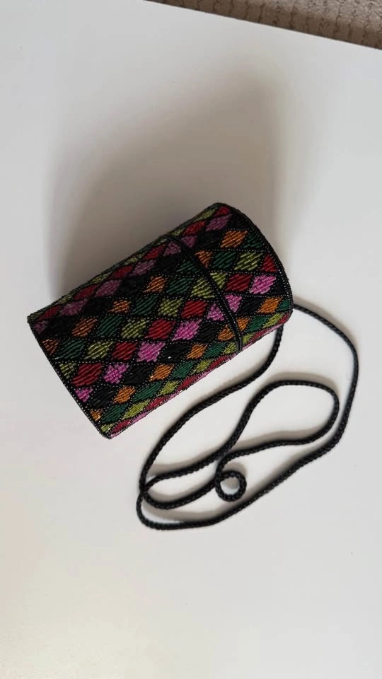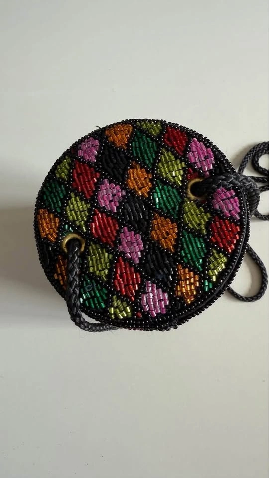 Fully beaded in vibrant jewel-tone colors, intricate craftsmanship, and a striking harlequin-style pattern