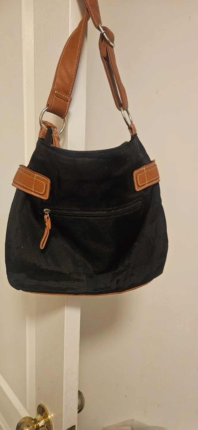 Here's a stylish black Roots crossbody bag! It has a brown trim and is in great condition. Perfect for carrying your essentials while keeping your hands free