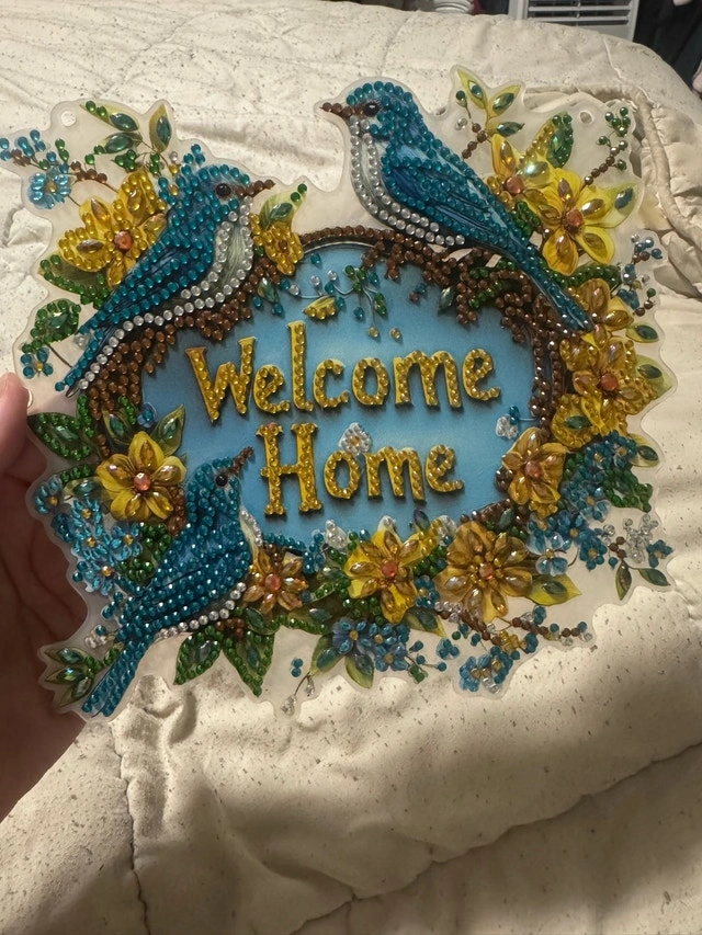 Add a touch of sparkle to your home with this beautiful, used diamond art 'Welcome Home' sign, adorned with vibrant bluebirds and colourful flowers. It is in good condition and ready to brighten up any space. It is made from plastic, resin diamonds, and measures approximately 12 inches in diameter.