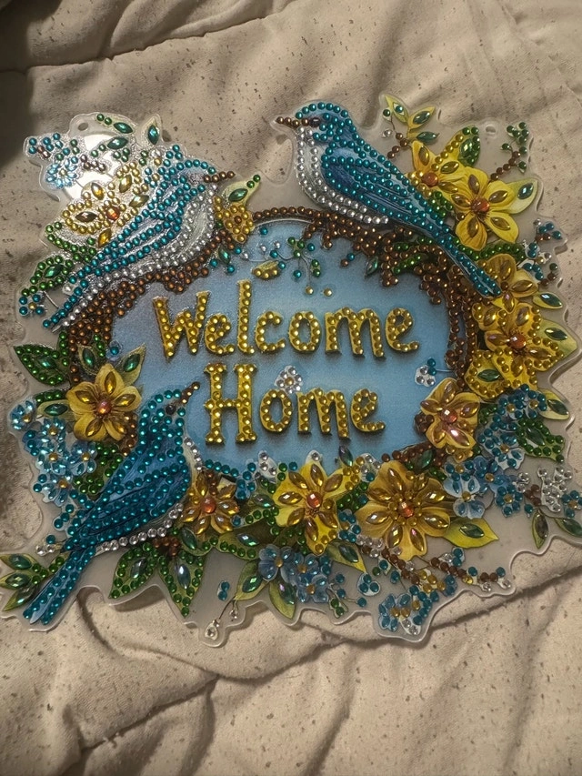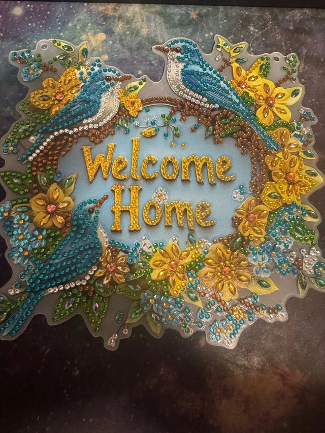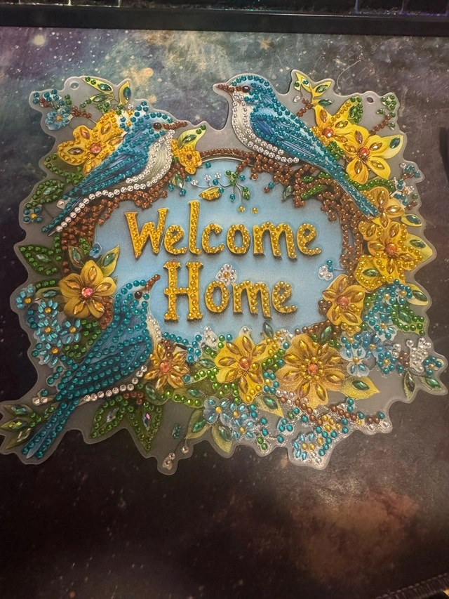Add a touch of sparkle to your home with this beautiful, used diamond art 'Welcome Home' sign, adorned with vibrant bluebirds and colourful flowers. It is in good condition and ready to brighten up any space. It is made from plastic, resin diamonds, and measures approximately 12 inches in diameter.