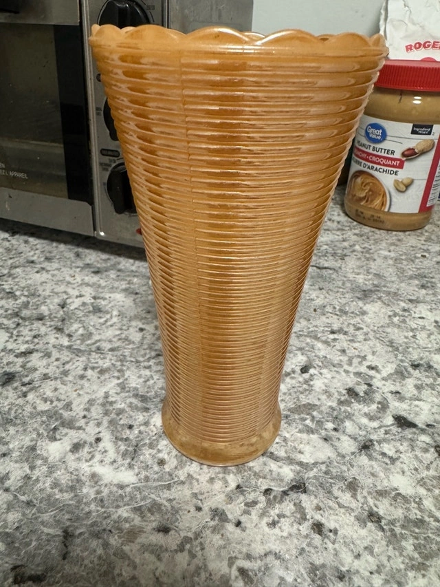 Add a touch of vintage charm to your home with this stunning, used Fenton Vase featuring a beautiful peach crest colour and a unique fluted design. This eye-catching vase stands approximately 8 inches tall, making it a perfect display piece for your favourite floral arrangements or as a standalone decorative accent. This is a used item, showing some wear and tear.