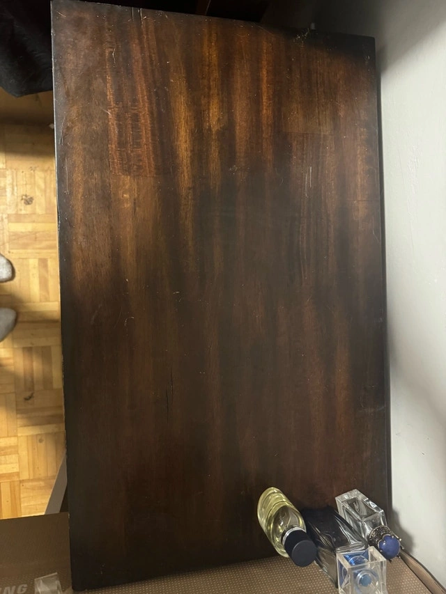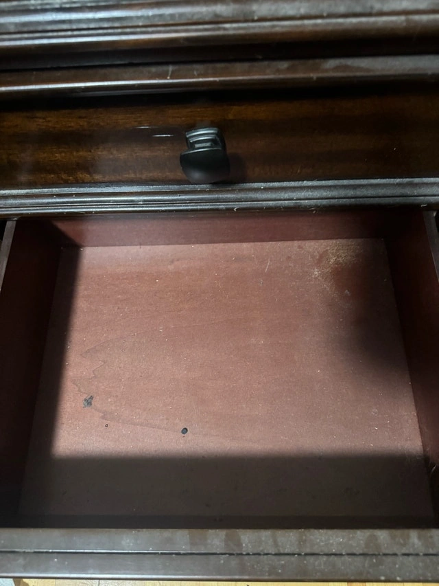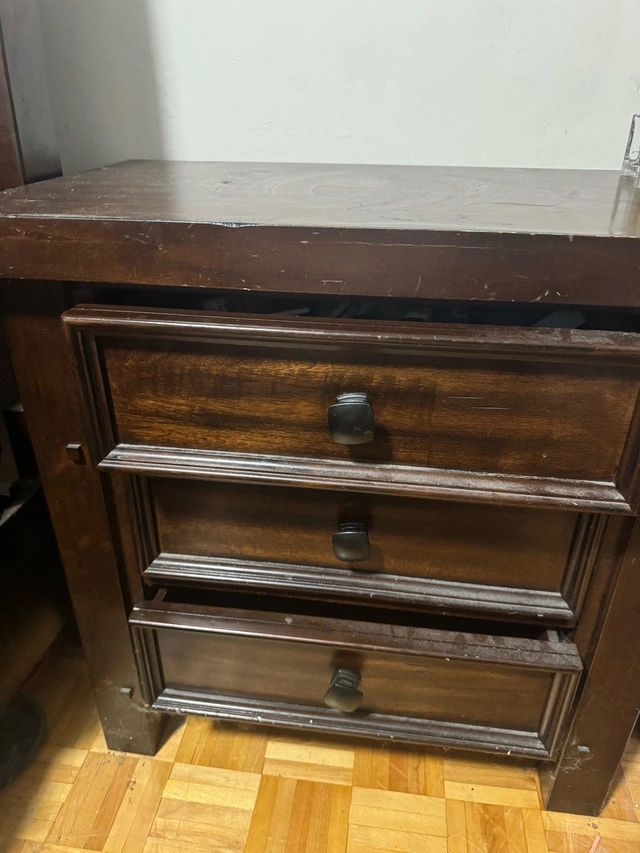 This is a dark wood nightstand with three drawers, perfect for your bedside needs. It's a sturdy piece with a classic design. As this is a used nightstand, there are minor signs of wear and tear, but it remains functional and aesthetically pleasing. * Three drawers for ample storage * Dark wood finish If the ad is up, it's available!