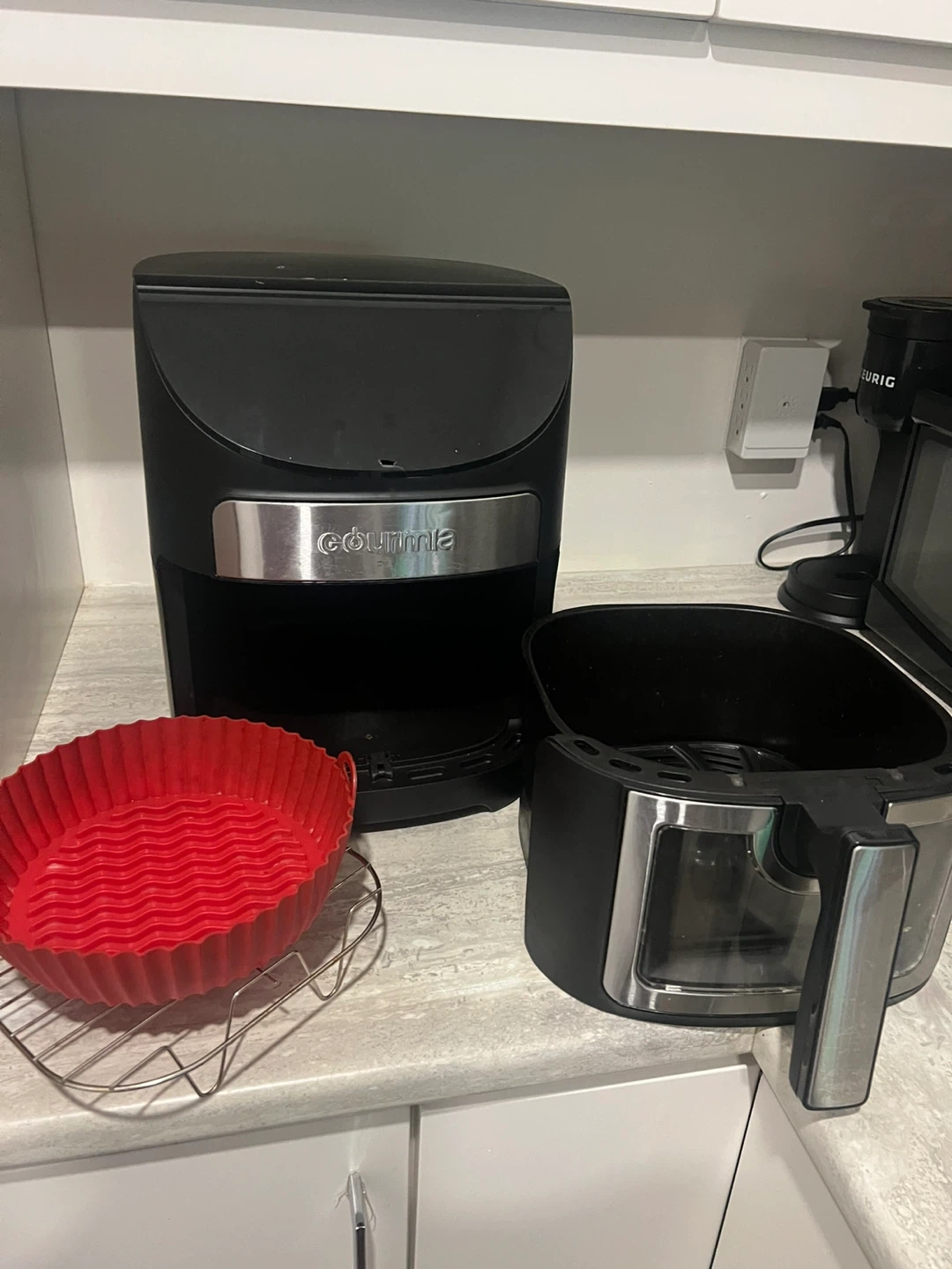Selling a Gourmia air fryer in great condition! It's black and comes with the basket. It also includes a red silicone basket and a metal rack. Perfect for making crispy snacks and meals