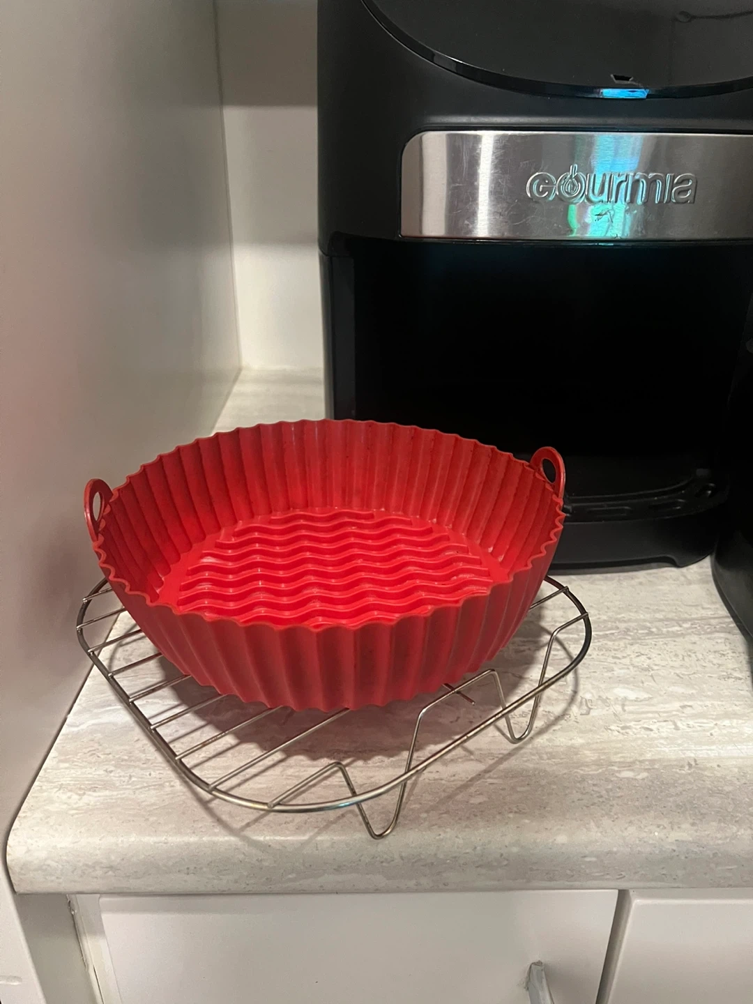 Selling a Gourmia air fryer in great condition! It's black and comes with the basket. It also includes a red silicone basket and a metal rack. Perfect for making crispy snacks and meals