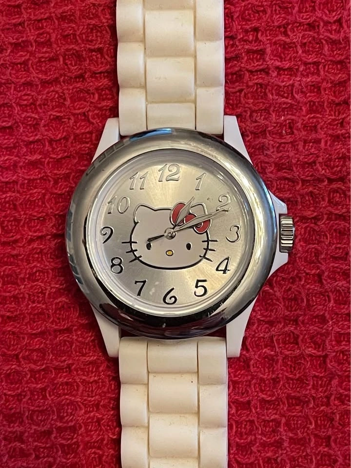 Cute and collectible Hello Kitty watch in very good condition. Recently cleaned and fitted with a new battery – works perfectly and keeps accurate time.