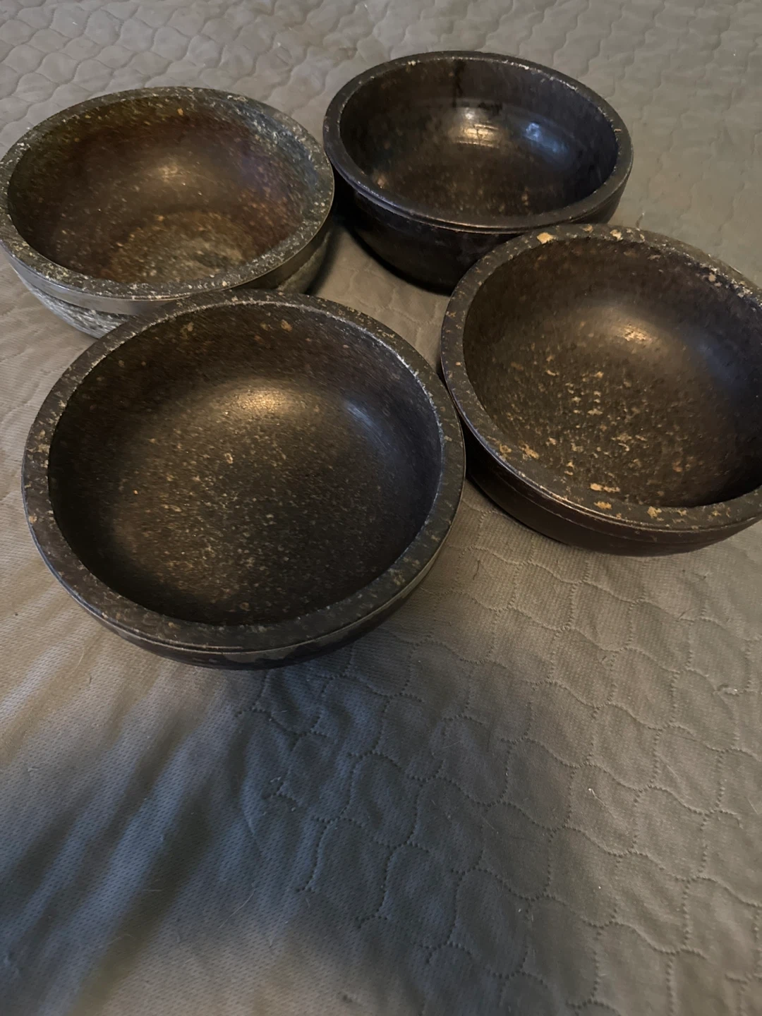 Selling a set of four dark stone bowls. They have a nice, rustic look and are perfect for serving or decoration. They show some signs of use but are still in good condition!