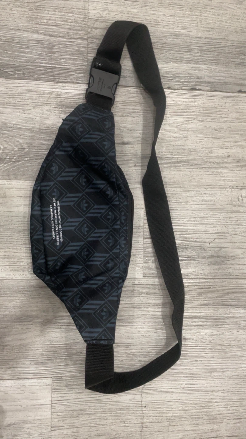 Here's an Adidas waist bag in great condition! It features a black and blue patterned design with the Adidas logo on the front. Perfect for carrying your essentials on the go!