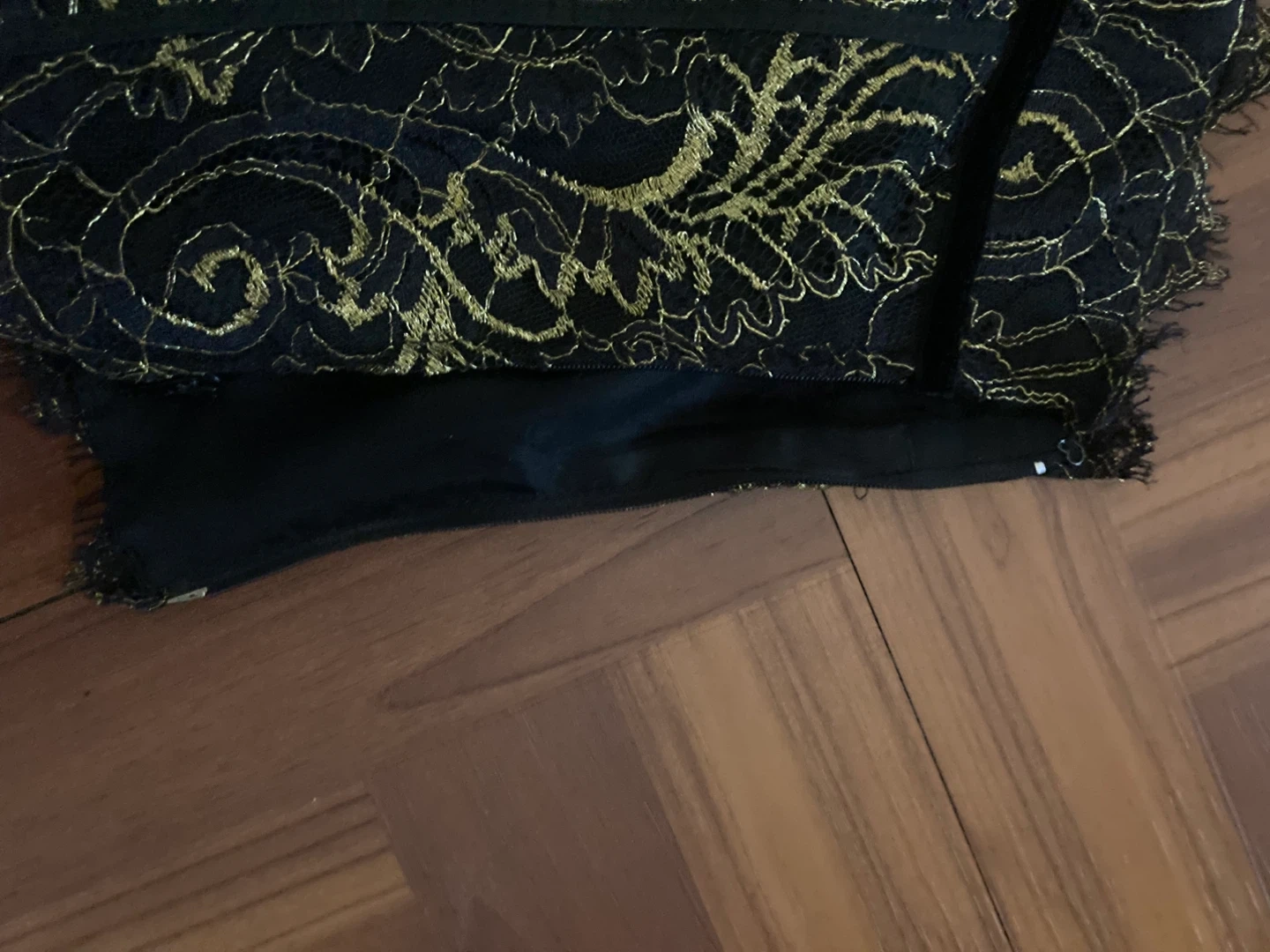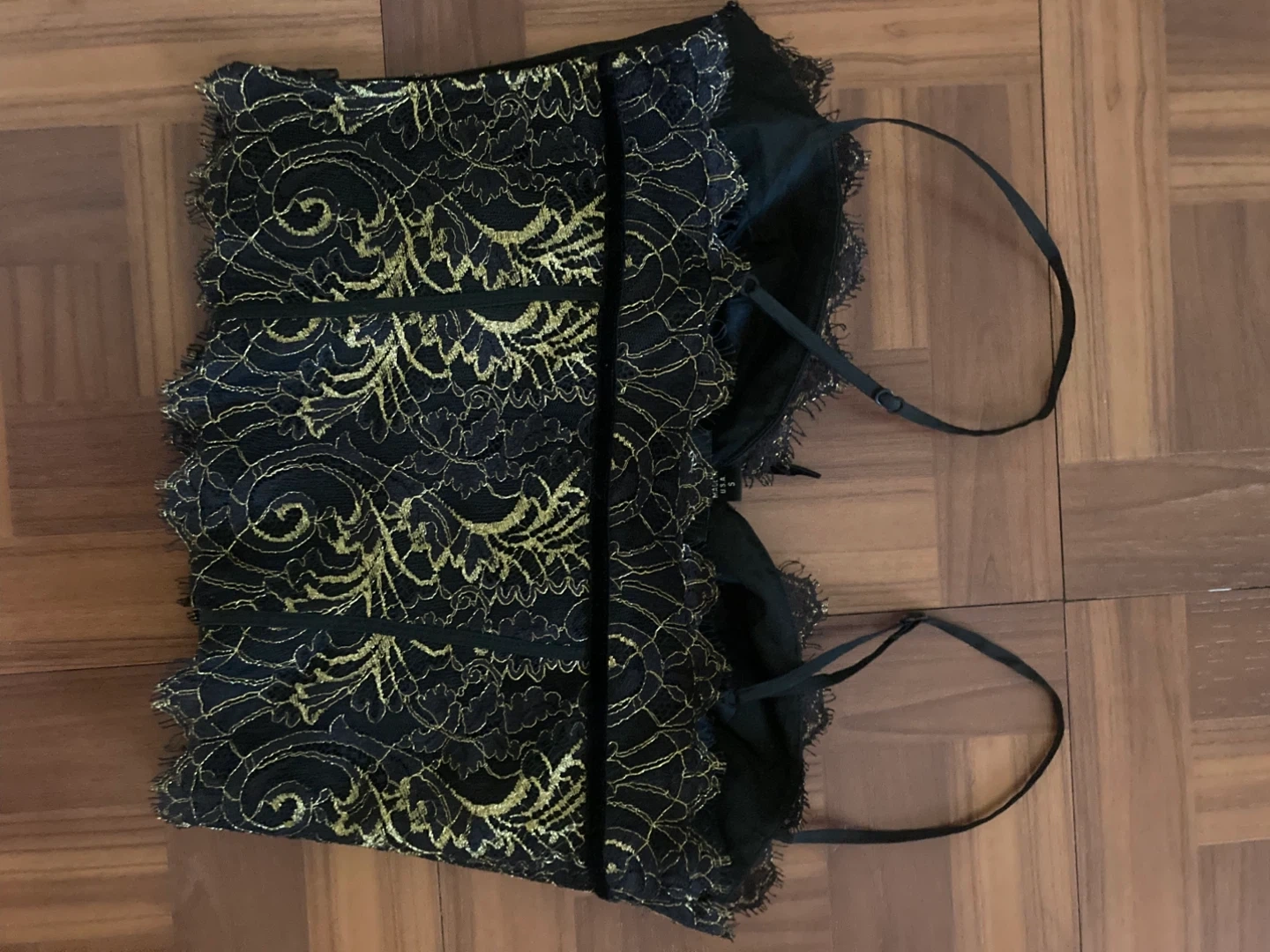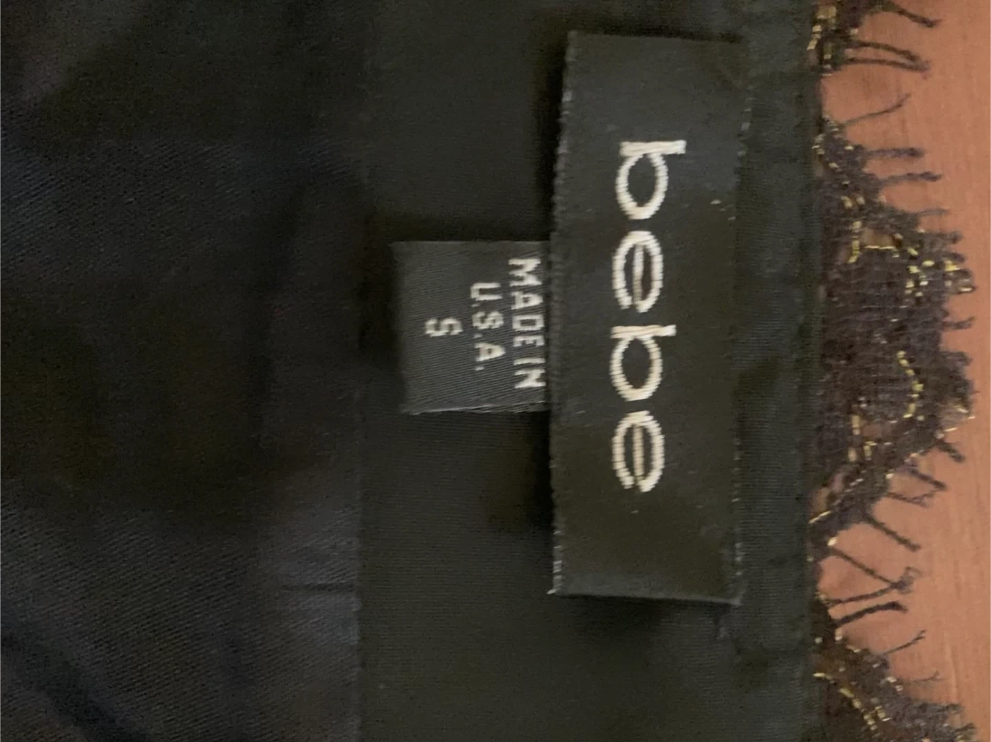 bebe black corset/bustier top with gold embroidered lace overlay and eyelash lace trim. Made in U.S.A., size Small. Adjustable spaghetti straps; structured corset silhouette—perfect as a Y2K “going out” / clubwear top or for party, holiday, NYE, festival, or dark romance looks. Pair with low-rise jeans, mini skirt, or leather pants.