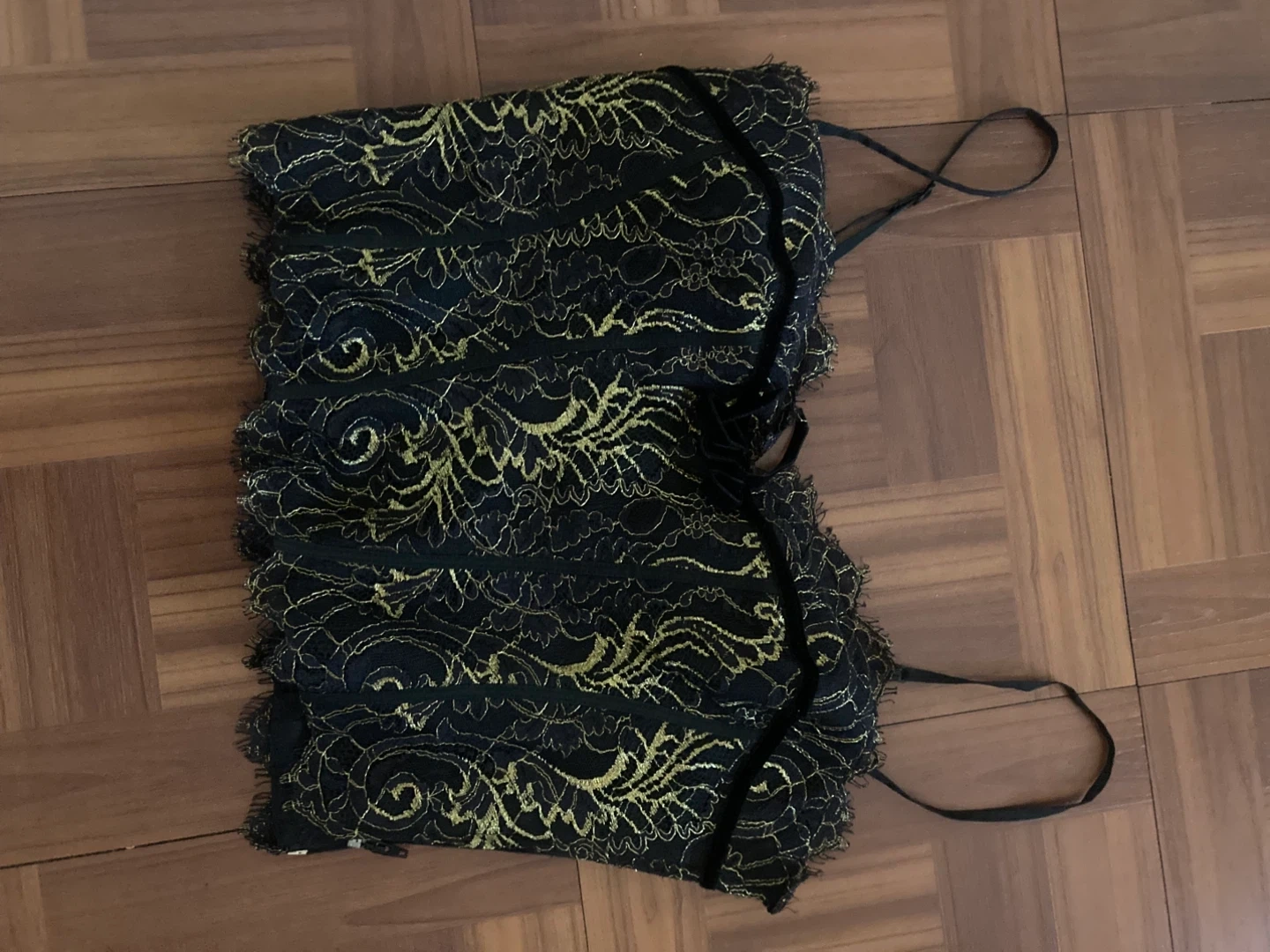 bebe black corset/bustier top with gold embroidered lace overlay and eyelash lace trim. Made in U.S.A., size Small. Adjustable spaghetti straps; structured corset silhouette—perfect as a Y2K “going out” / clubwear top or for party, holiday, NYE, festival, or dark romance looks. Pair with low-rise jeans, mini skirt, or leather pants.
