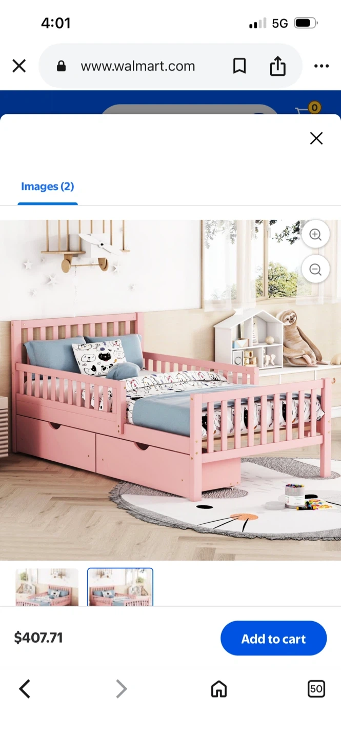 A super cute pink toddler bed with built-in storage drawers! Perfect for transitioning your little one to their first big kid bed. The drawers underneath offer great space for storing toys, books, or extra bedding. It was originally bought for $407.71