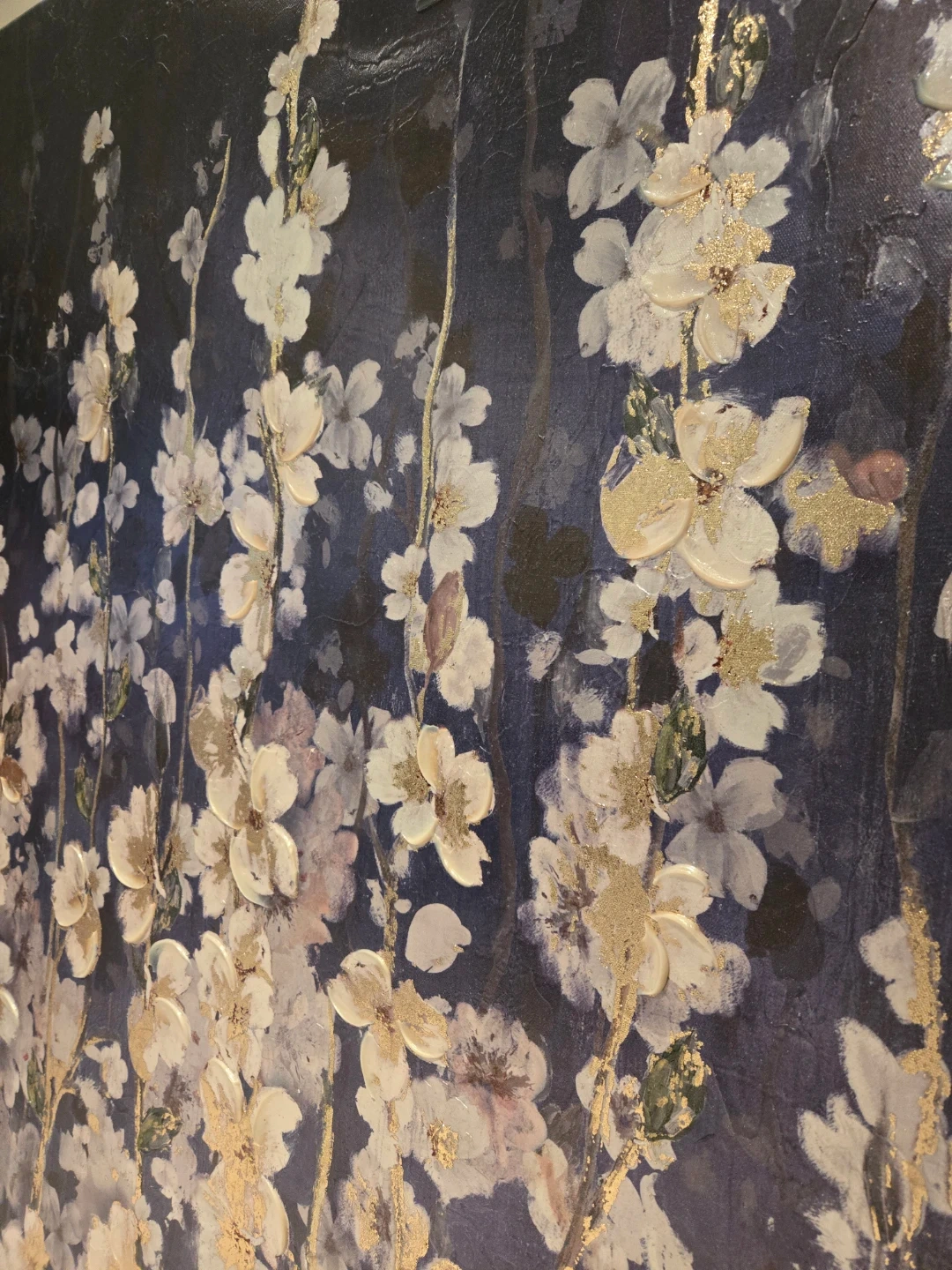 Selling a sophisticated large sized canvas floral wall painting in tones of navy blue, creamy white, Grey and pale gold. Size is 36" x 36". It's in great condition and would look beautiful in any room. The colours are soft and calming, perfect for adding a touch of elegance to your home decor!