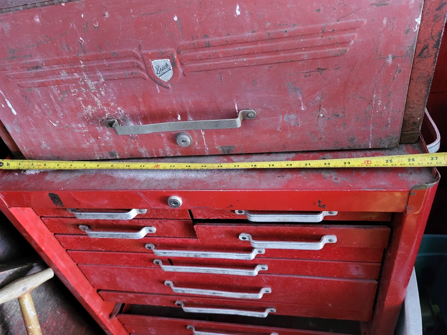 Selling a vintage Beach tool chest. The chest is about 27 inches wide and 17 inches deep. Great for storing your tools and keeping them organized! Listing for a friend.