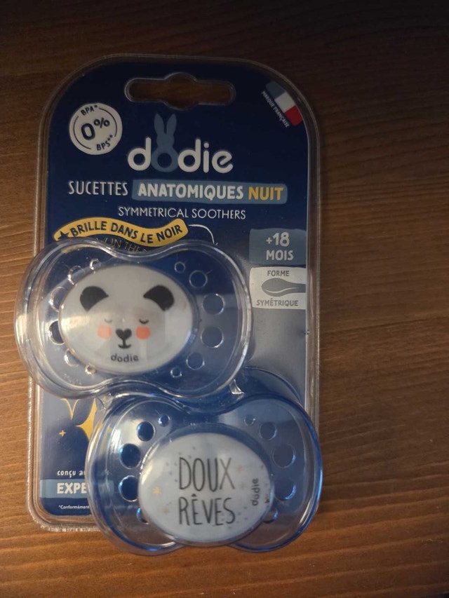 These Dodie Anatomiques Nuit symmetrical soothers are designed for babies 18+ months and feature glow-in-the-dark designs for nighttime use, making them easy to find in the dark; this is a new item. * Symmetrical Shape: Designed to respect the baby's mouth and promote natural sucking. * Nighttime Use: Glow-in-the-dark feature helps locate pacifiers in the dark. * Age Recommendation: Suitable for babies 18 months and older. * Material: BPA and BPS free Snag these glow-in-the-dark buddies for your little one! They're not just pacifiers; they're tiny nightlights for tiny humans.