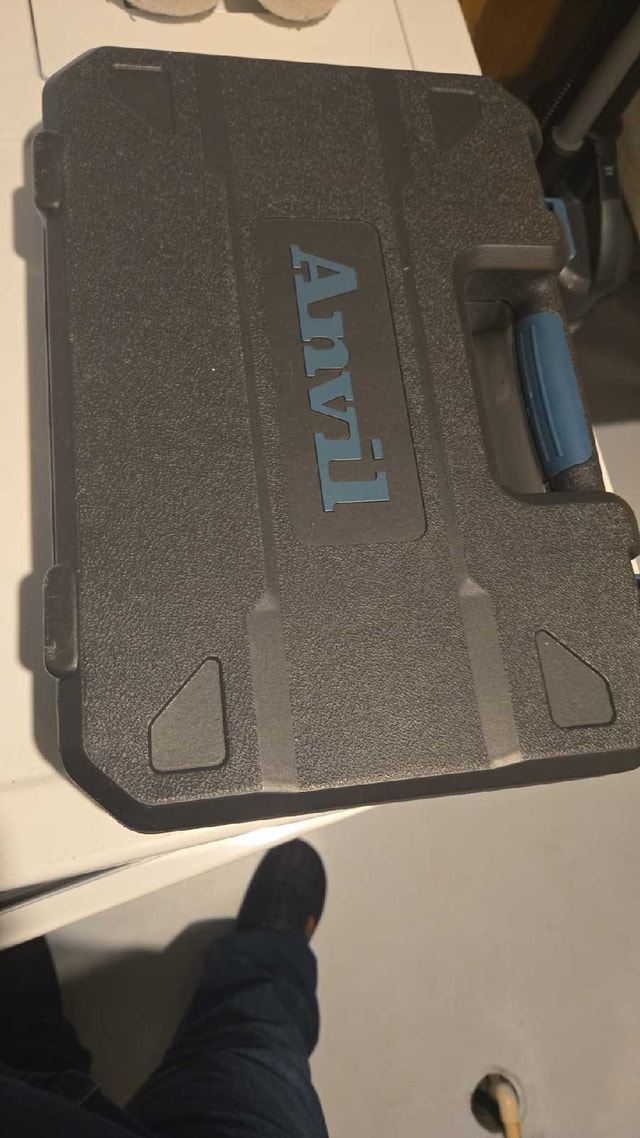 This Anvil tool set includes a comprehensive collection of essential tools for various home and DIY projects. The set is in good condition and includes a hammer, screwdrivers, wrenches, pliers, a level, measuring tape, and various other bits and fasteners, all neatly organized in a durable carrying case. Here's a closer look at what's inside: