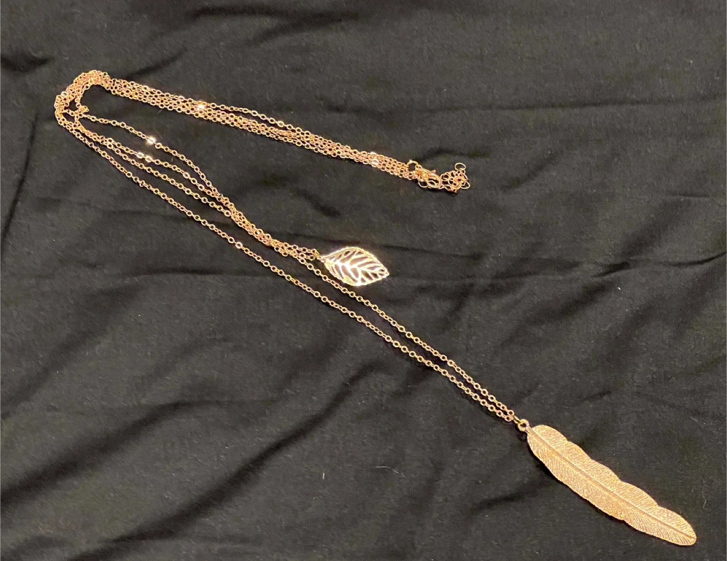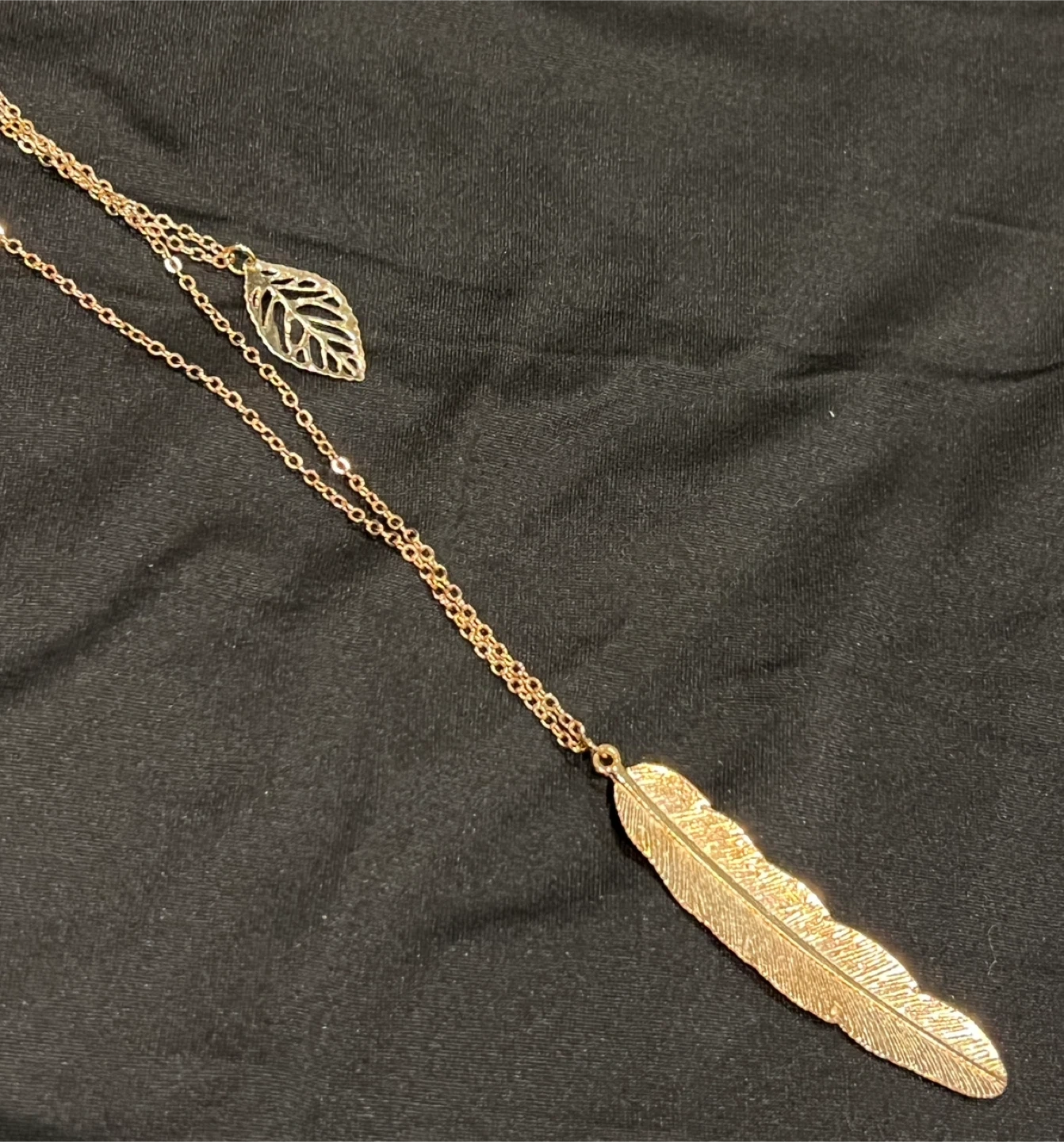 Add a touch of elegance to your outfit with this beautiful rose gold layered necklace! It features a delicate leaf charm and a stylish feather pendant. Perfect for any occasion!