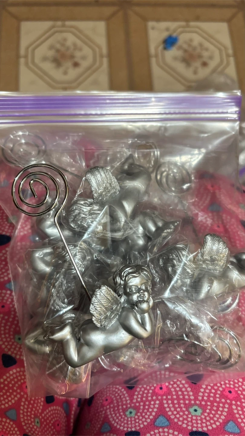 These adorable silver angel place card holders are perfect for adding a touch of whimsy to any event! They are in great condition and ready to hold your place cards or photos.