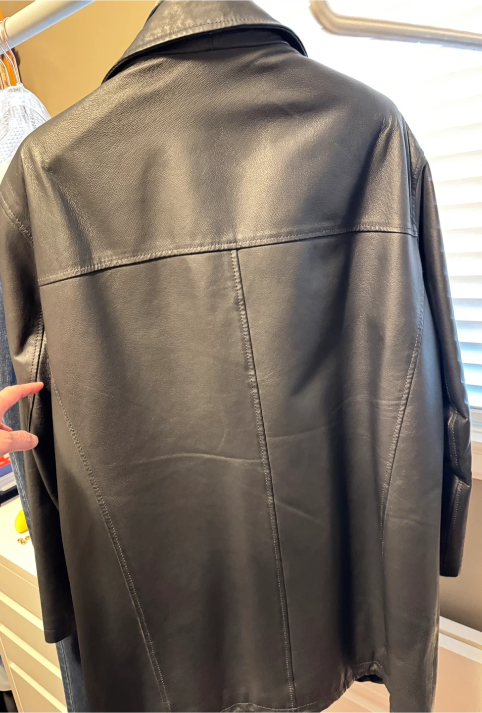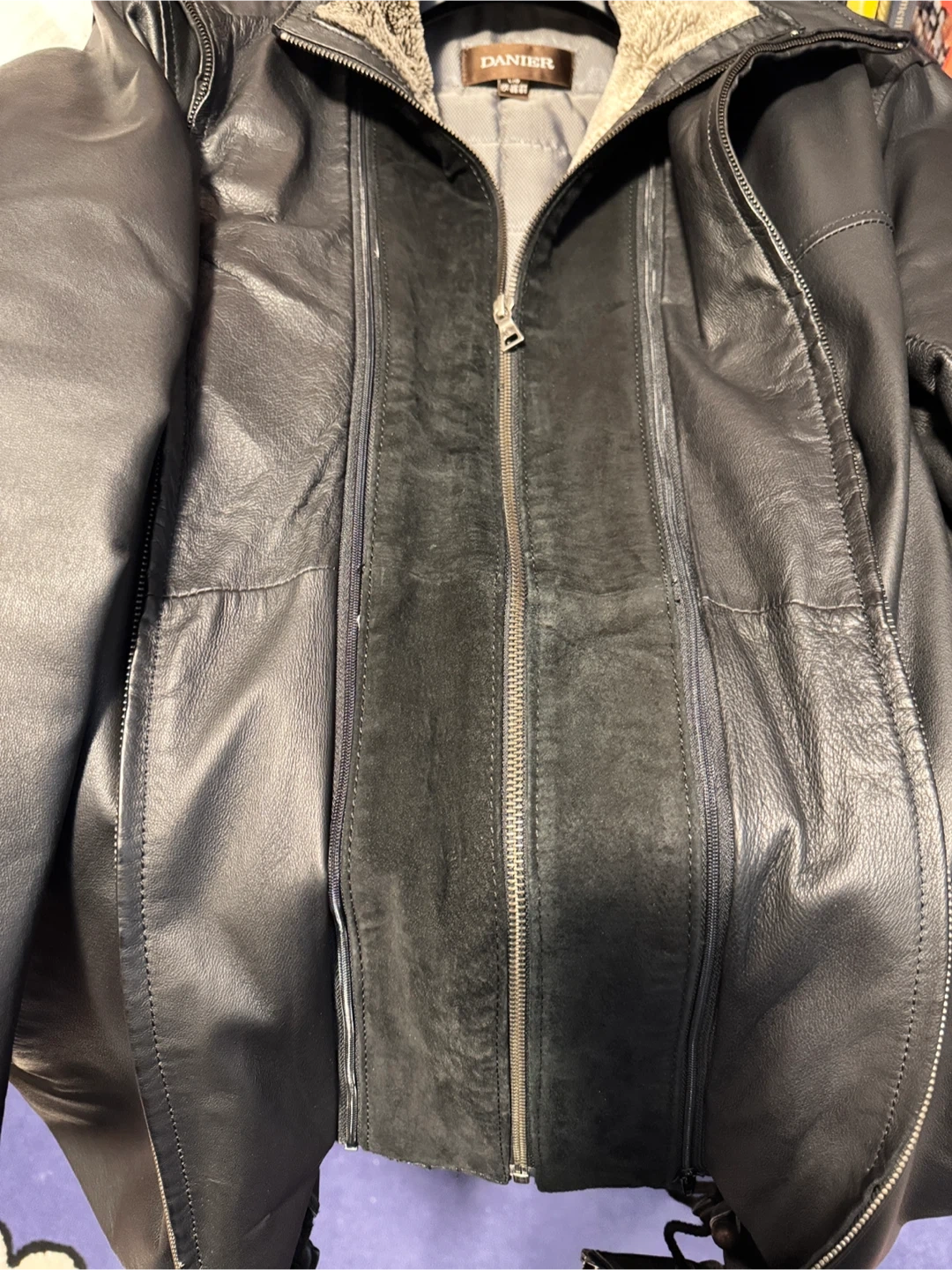 Selling a Danier leather jacket in size L/G. It's in great condition and features a cozy collar lining.