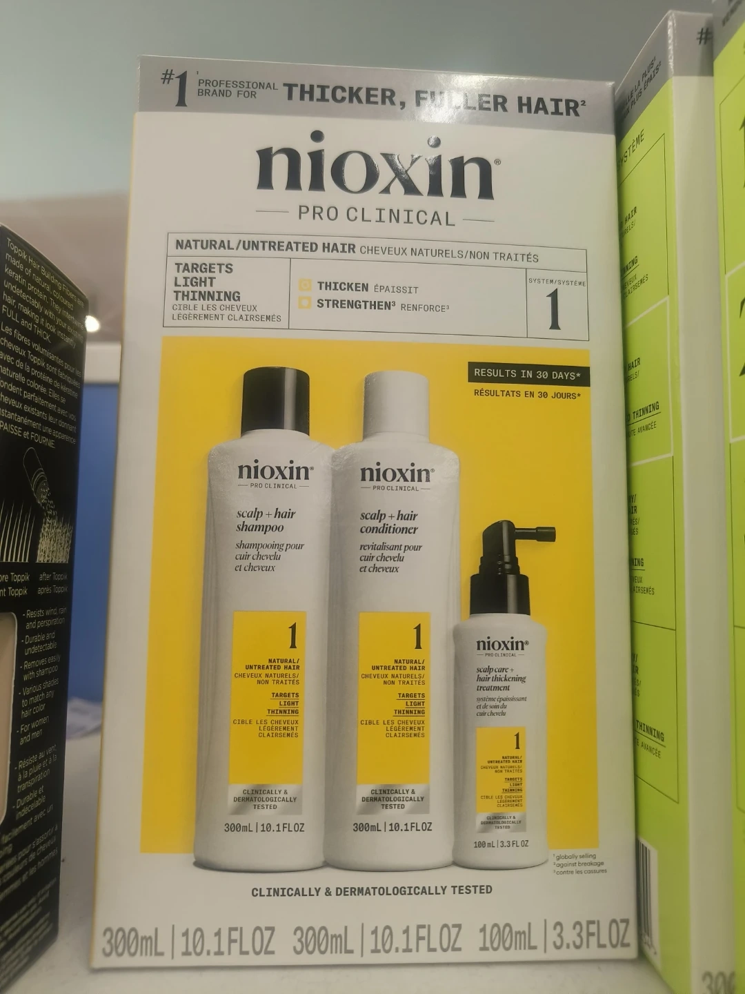 Selling a Nioxin Pro Clinical System 1 kit for natural and untreated hair. This kit targets light thinning and includes a scalp + hair shampoo (300ml), a scalp + hair conditioner (300ml), and a scalp care + hair thickening treatment (100ml). It's clinically and dermatologically tested for your peace of mind