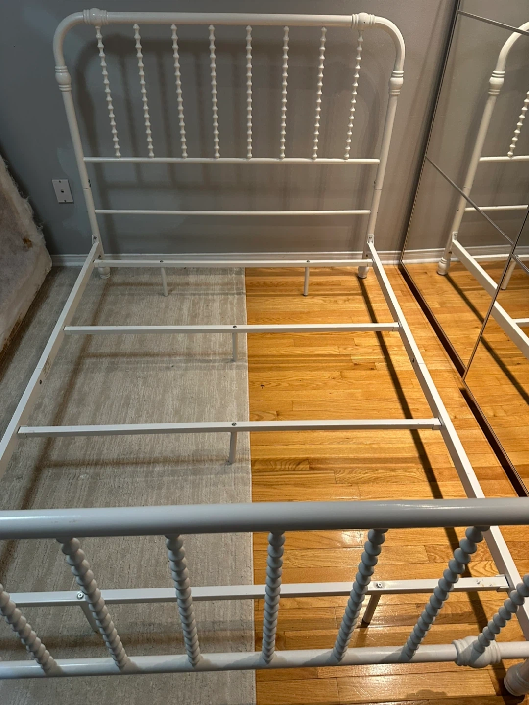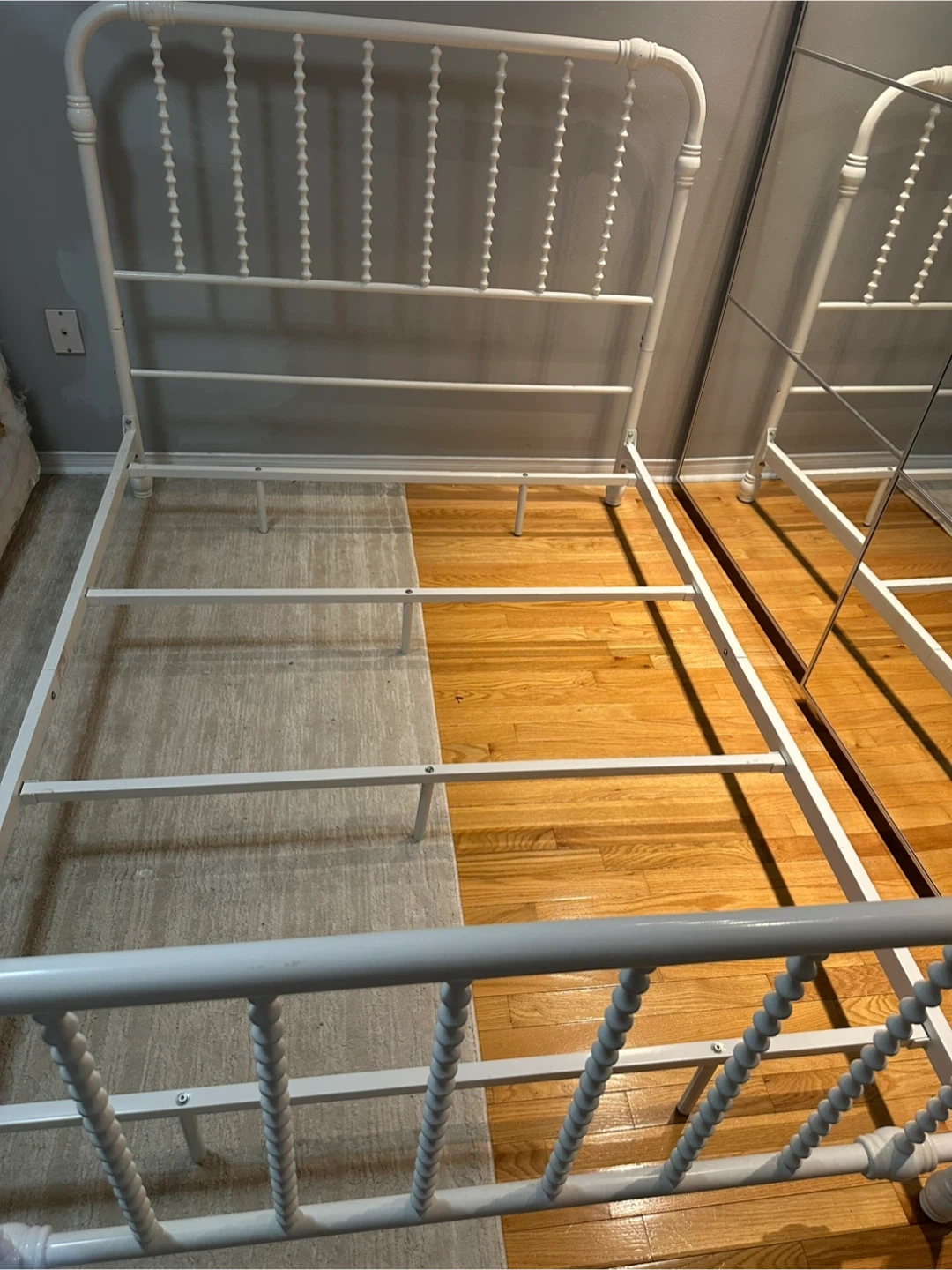 Here's a sturdy white metal bed frame ready for a new mattress! It's in good condition and would be a great addition to any bedroom. It has a classic design that would fit well with many decor styles