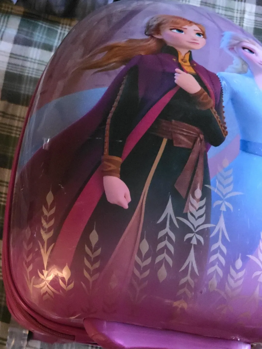 Selling a Frozen themed kids luggage featuring Anna and Elsa! This cute luggage is perfect for your little one's travels or sleepovers. It has a hard shell and a zipper closure.