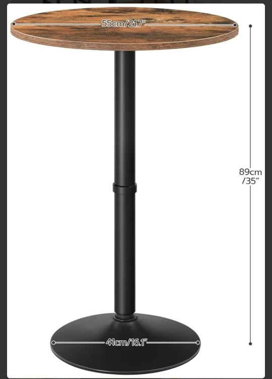 Looking to sell this adjustable round bar table! It features a rustic brown top and a sleek black base. The dimensions are approximately 89cm high.