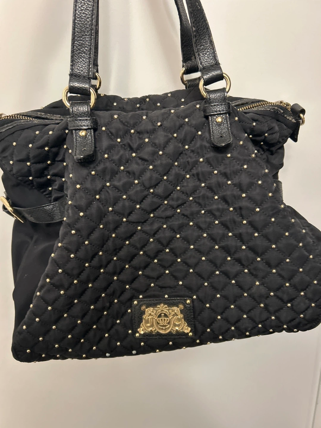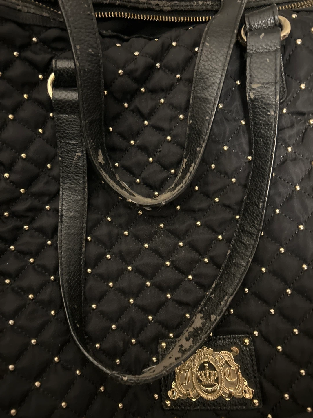 Selling a Juicy Couture tote bag in black. It has a quilted design with gold studs. The handles show some wear, but it's still a stylish bag!
