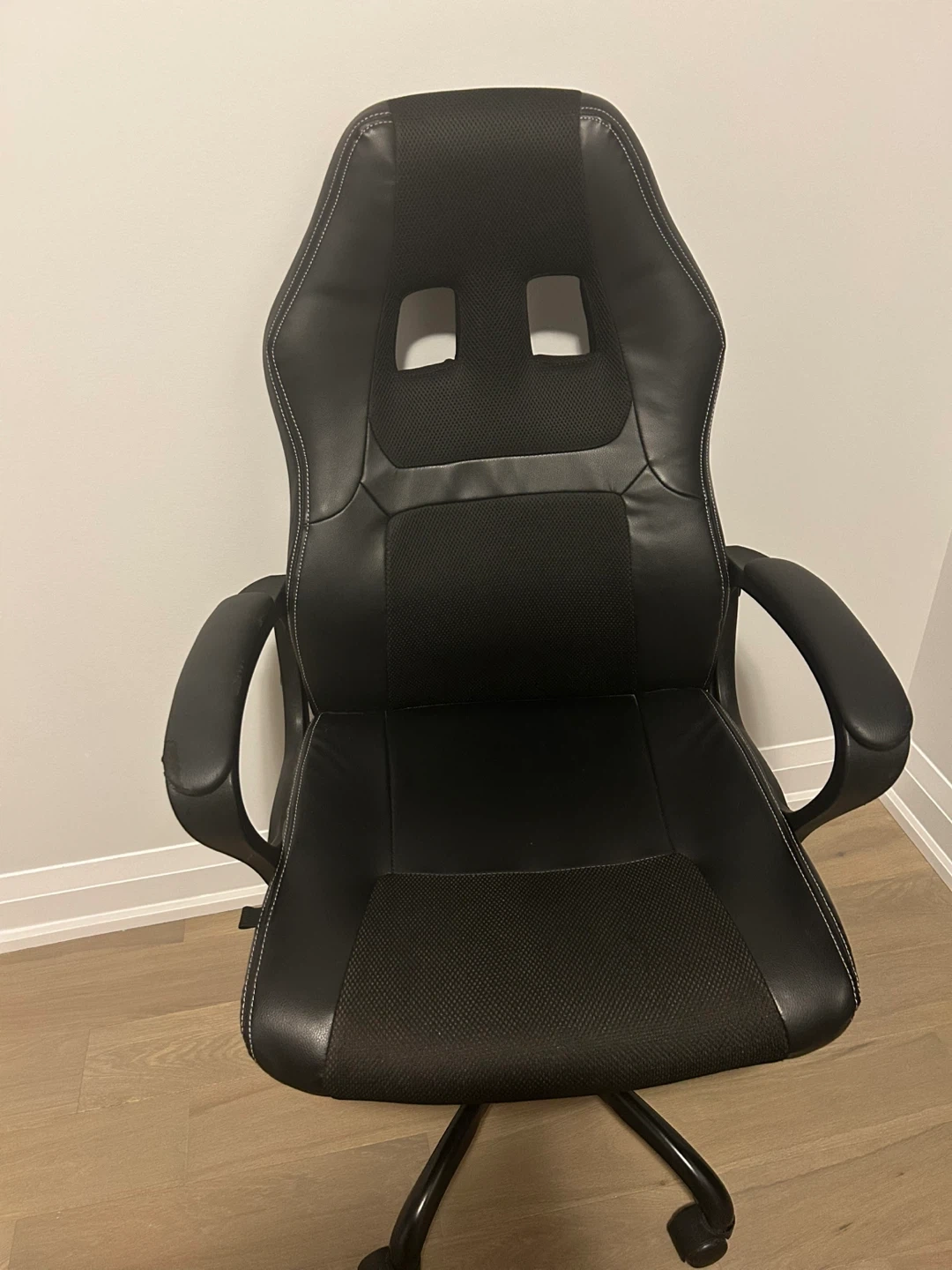Selling a black gaming chair. There are some signs of wear and tear on the arm rests and the back of the chair, as shown in the pictures. It's still a comfy chair to use!
